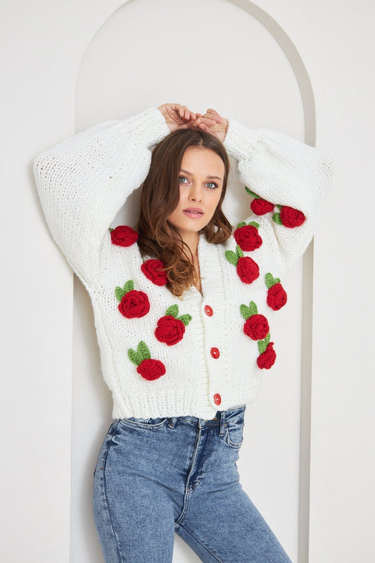 Sweter dzianinowy z haftowanym srebrnym kwiatem