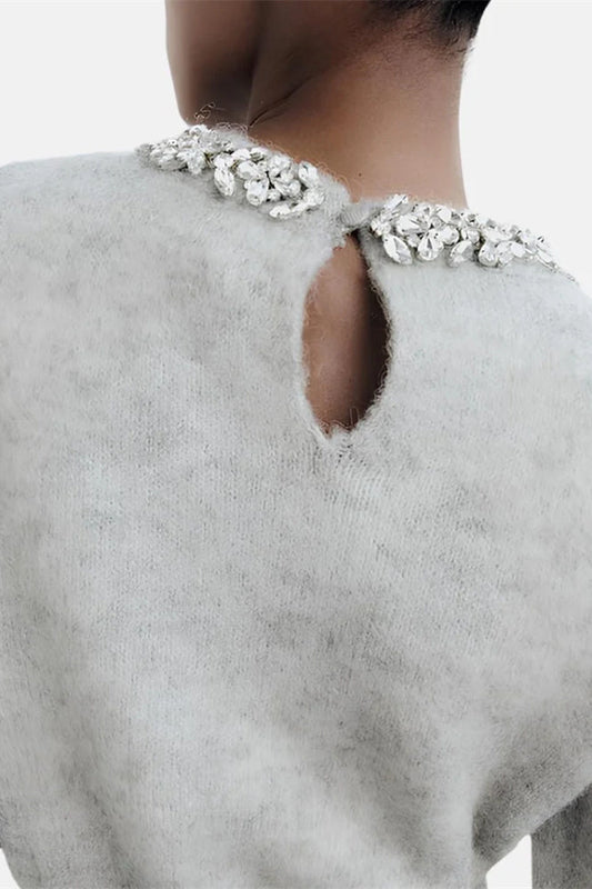 Sweter dzianinowy z okrągłym dekoltem i zdobiony kryształkami