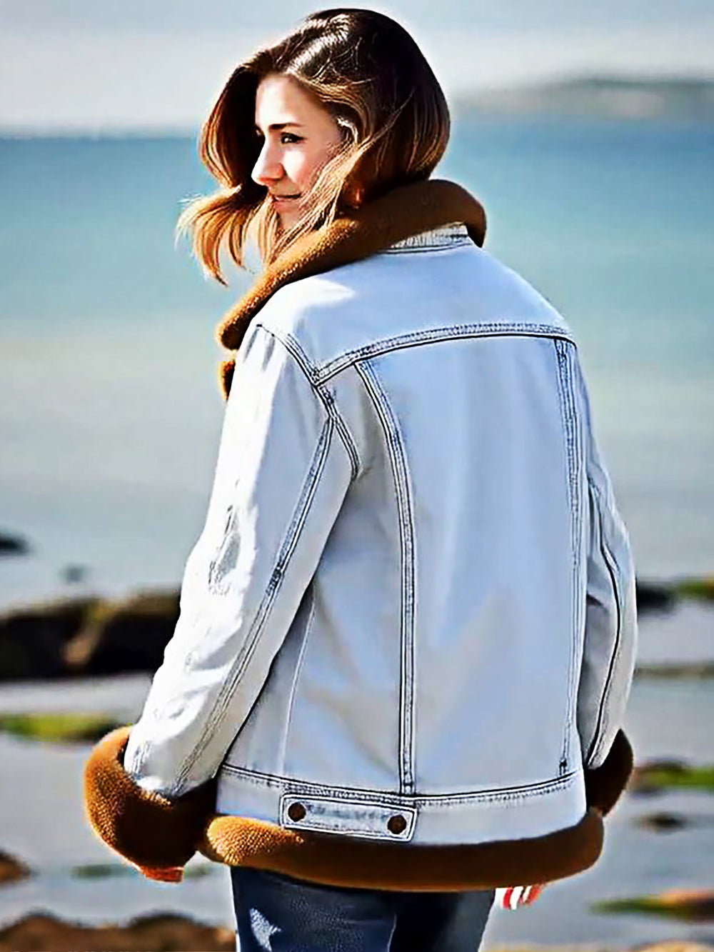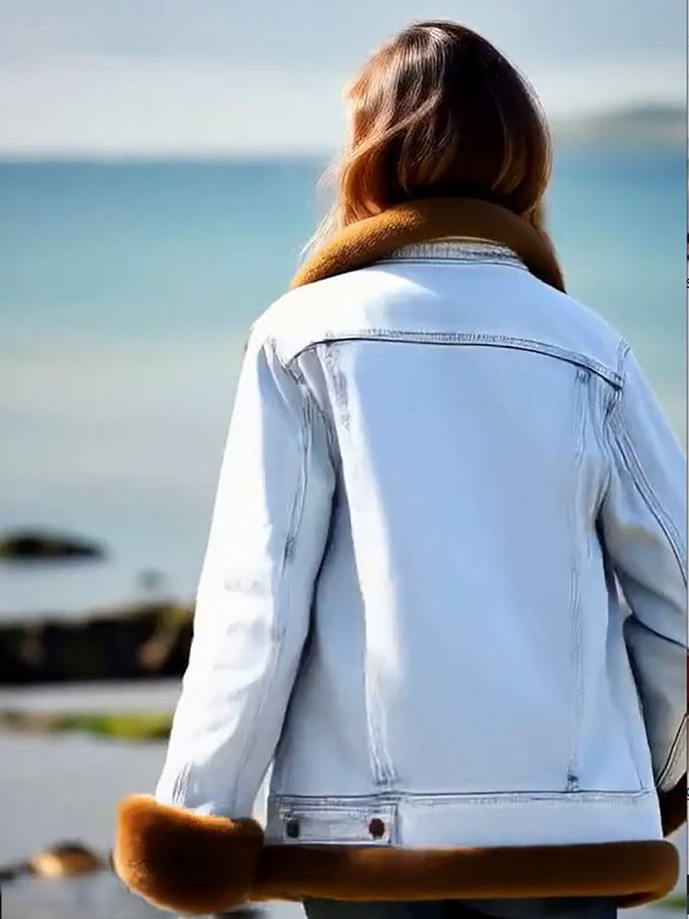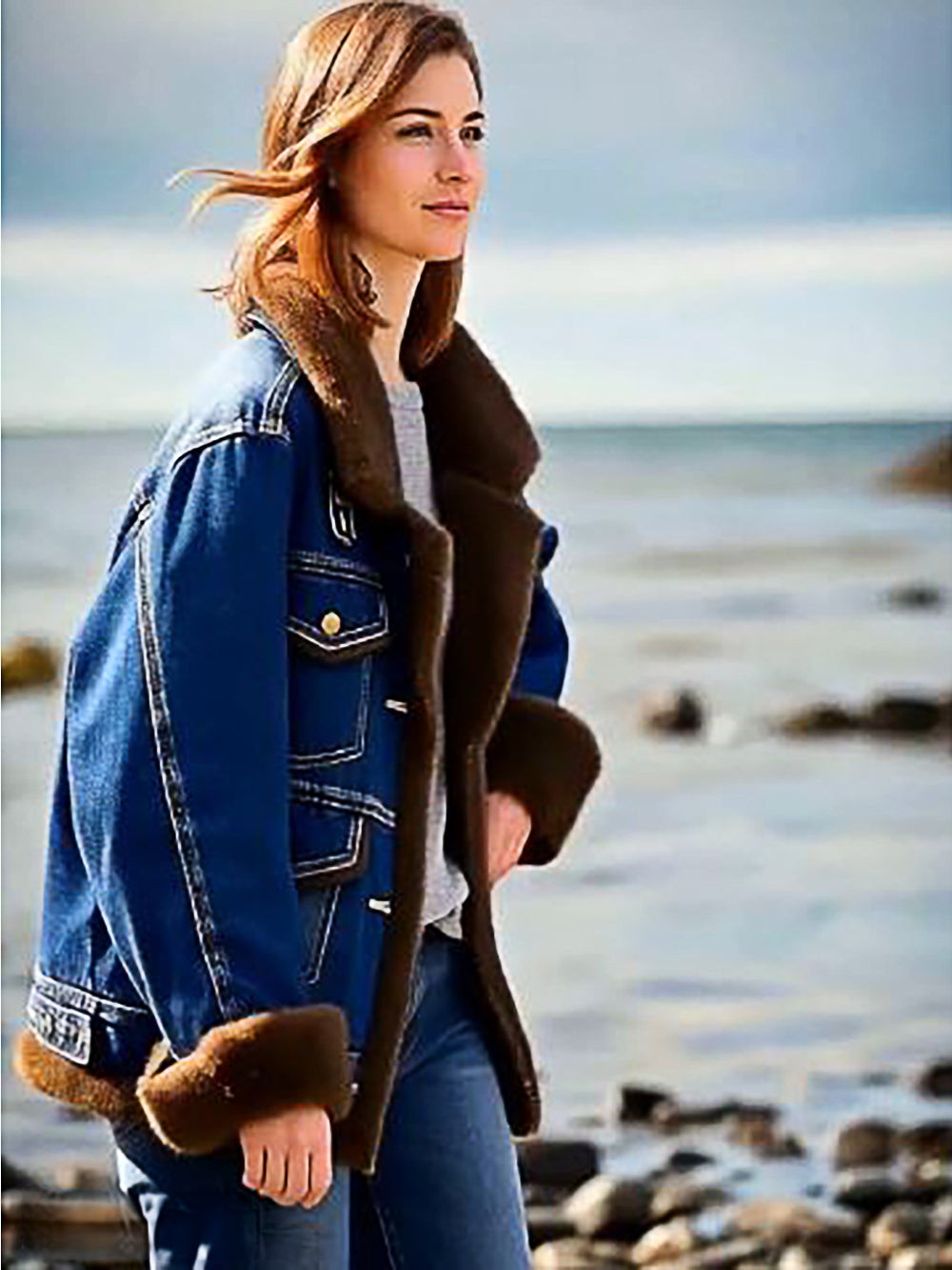 Płaszcz z denimu Ashore w kolorze washed łączy surowy wygląd z luksusowym komfortem. Luźny krój, wykonany z denimu w średnim odcieniu, podszyty grubym, miękkim, brązowym sztucznym futerkiem przy kołnierzu, mankietach, listwie zamkowej i u dołu, zapewnia doskonałe ciepło i wyrazisty kontrast. Złote guziki podkreślają wielokieszeniowy fason, nadając mu praktyczny, a jednocześnie inspirowany stylem vintage wygląd. Wyprofilowane ramiona i szeroki krój tworzą wyrazistą sylwetkę, idealną zarówno do swobodnych, jak i stylowych stylizacji, a także jako element warstwowy w chłodniejsze dni.