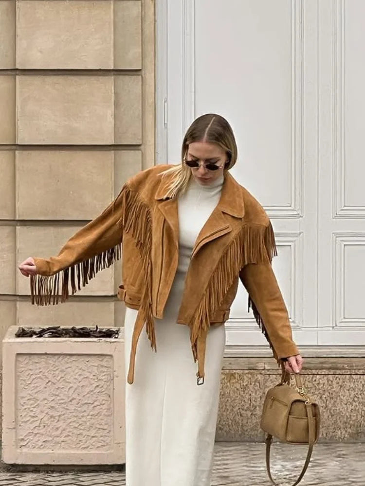 Kurtka zamszowa z frędzlami w kolorze karmelu
