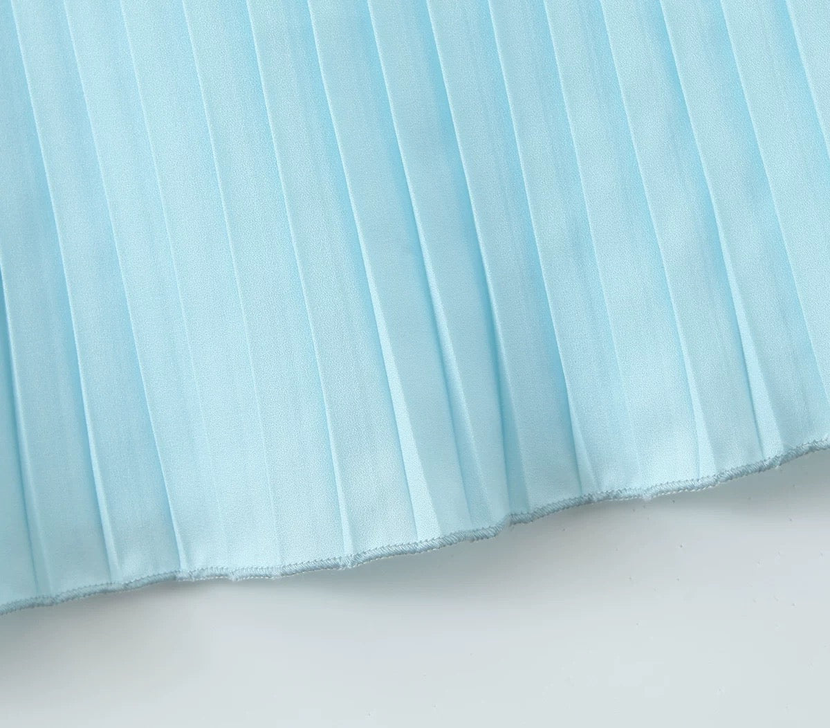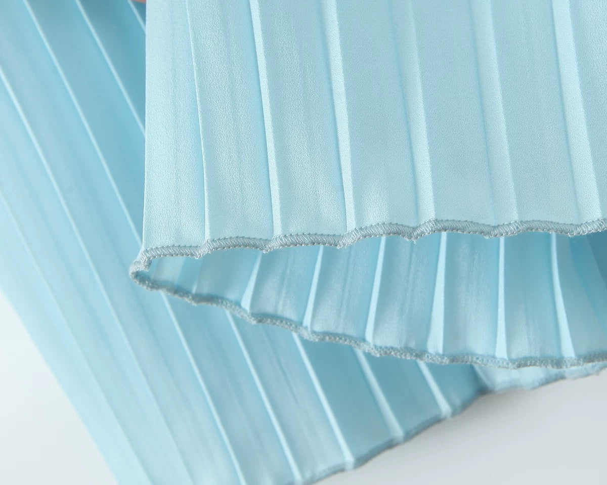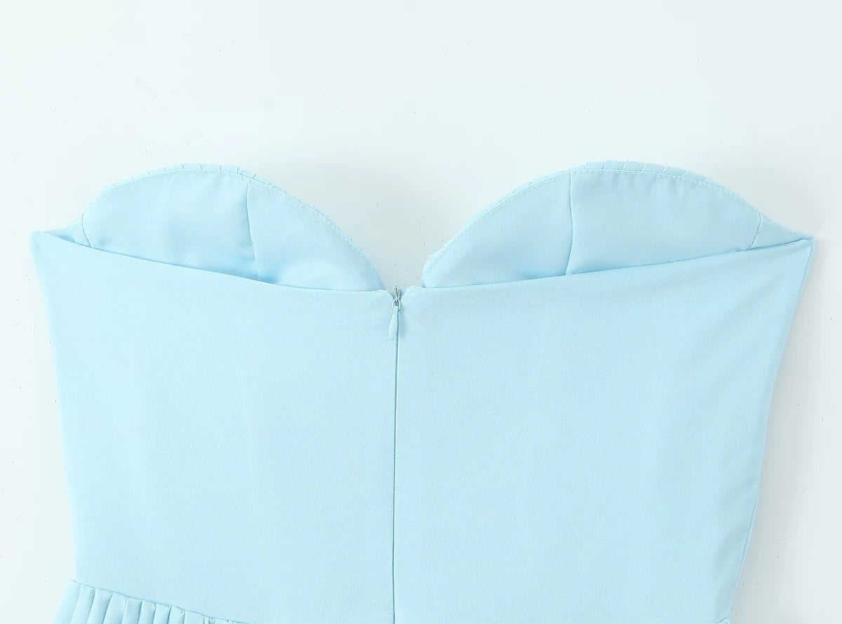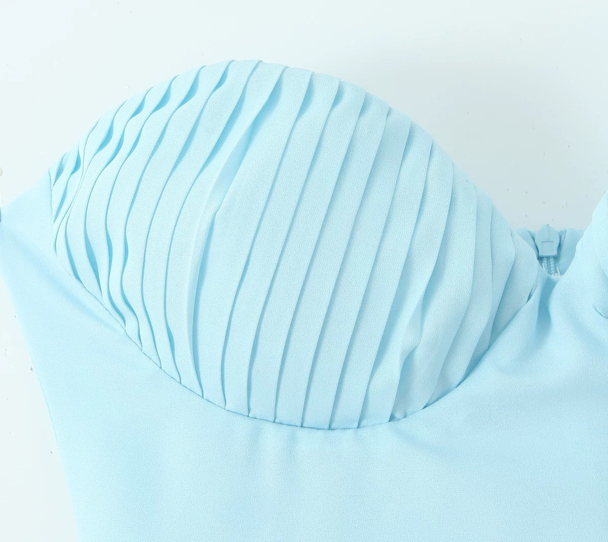 Ta elegancka plisowana sukienka ma gorset w stylu bustier, usztywniony kształtnymi miseczkami i delikatnymi plisami, które dodają objętości i tekstury. Wysoki stan przechodzi w całkowicie plisowaną spódnicę o kroju litery A, która dodaje ruchu i wdzięku z każdym krokiem. Dekolt bez ramiączek optycznie wydłuża szyję i podkreśla ramiona, a zamek błyskawiczny z tyłu zapewnia idealne dopasowanie.