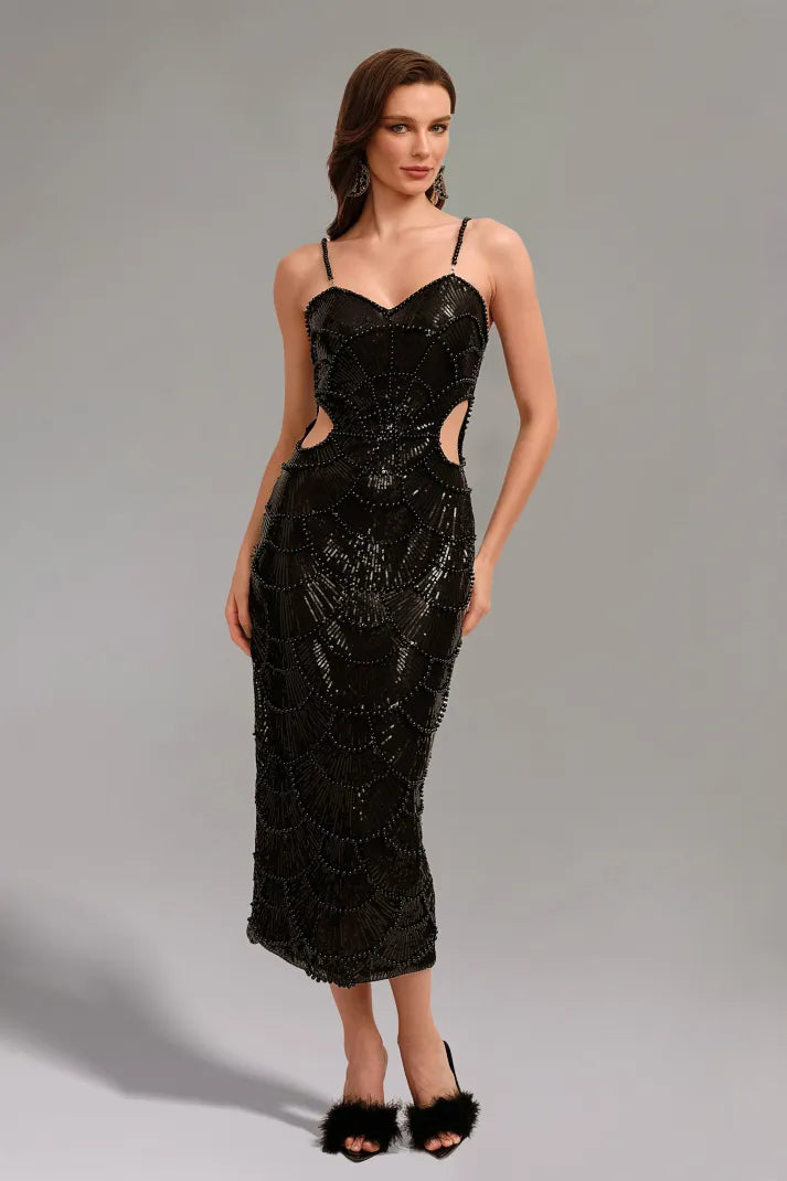 Teressa Black Pearl Ozdobna Długa Sukienka na Ramiączkach