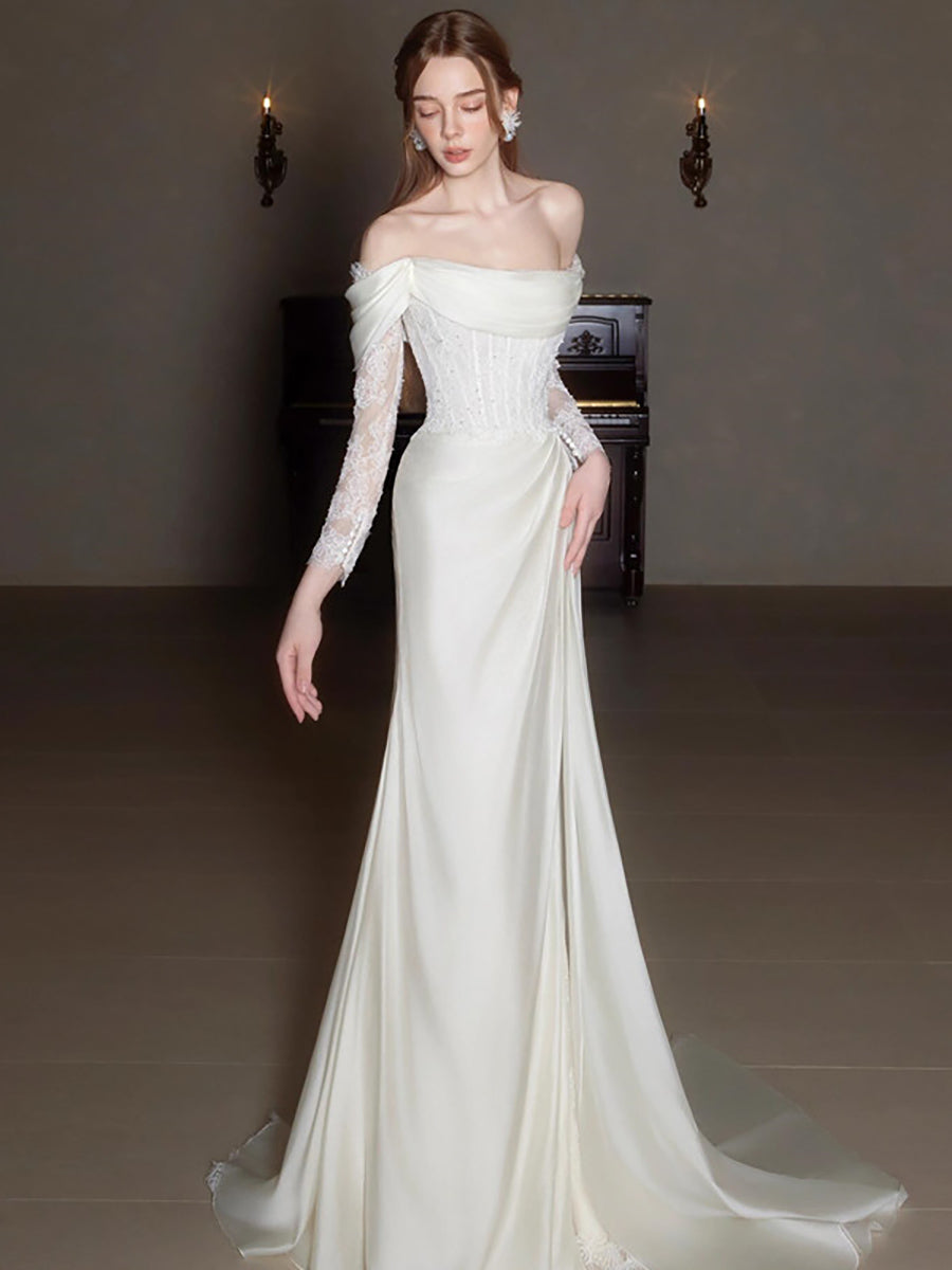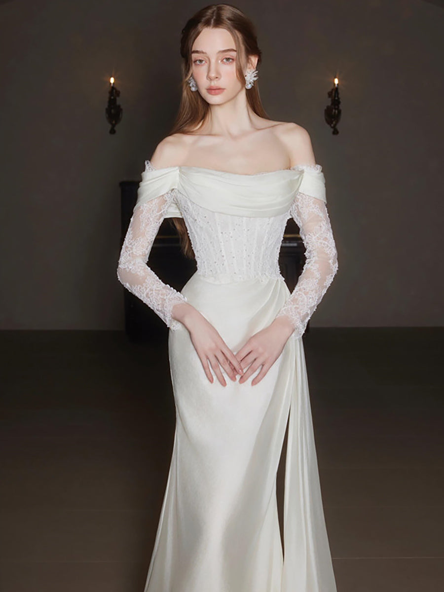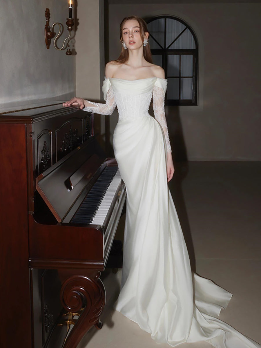 - Elegancja inspirowana stylem vintage: Drapowany satynowy dekolt, odsłaniający ramiona, w połączeniu z długimi, przezroczystymi koronkowymi rękawami łączy w sobie romantyzm retro z nowoczesną elegancją.