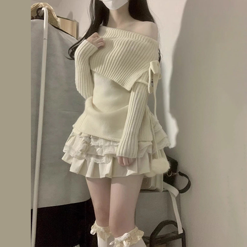 Sweter z odkrytymi ramionami, ściągaczem, kokardą i rozcięciem.