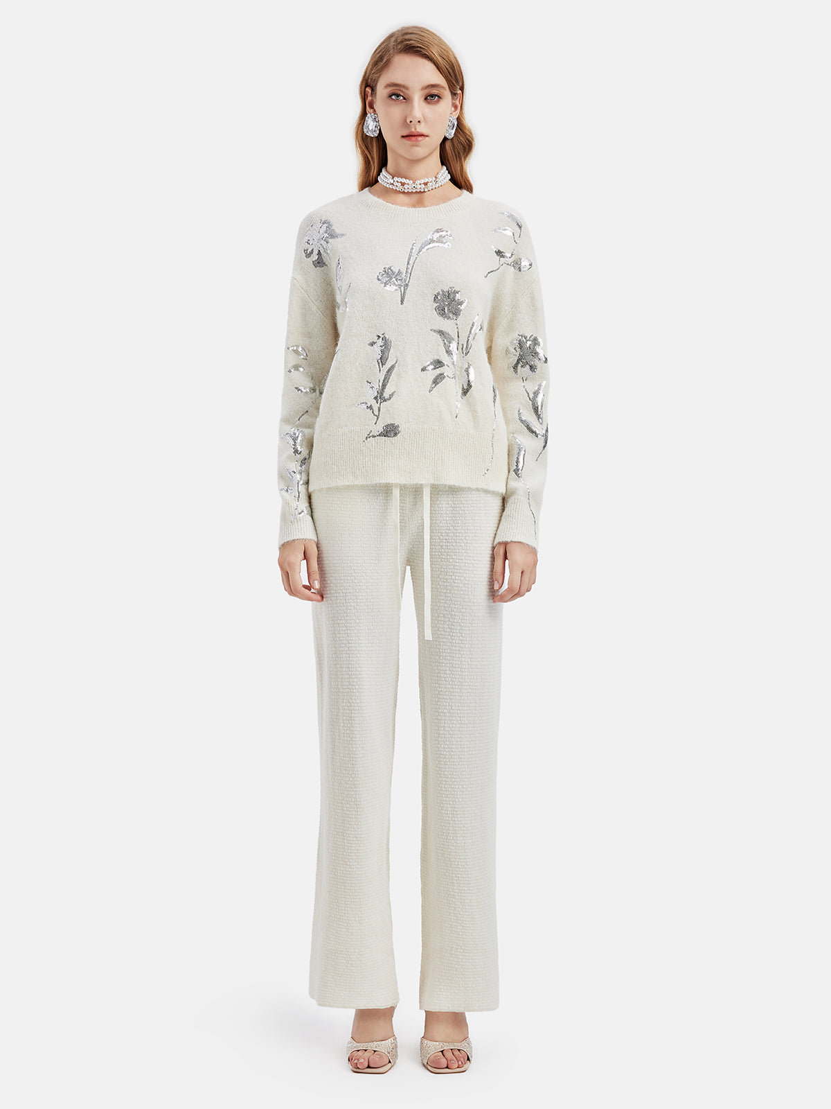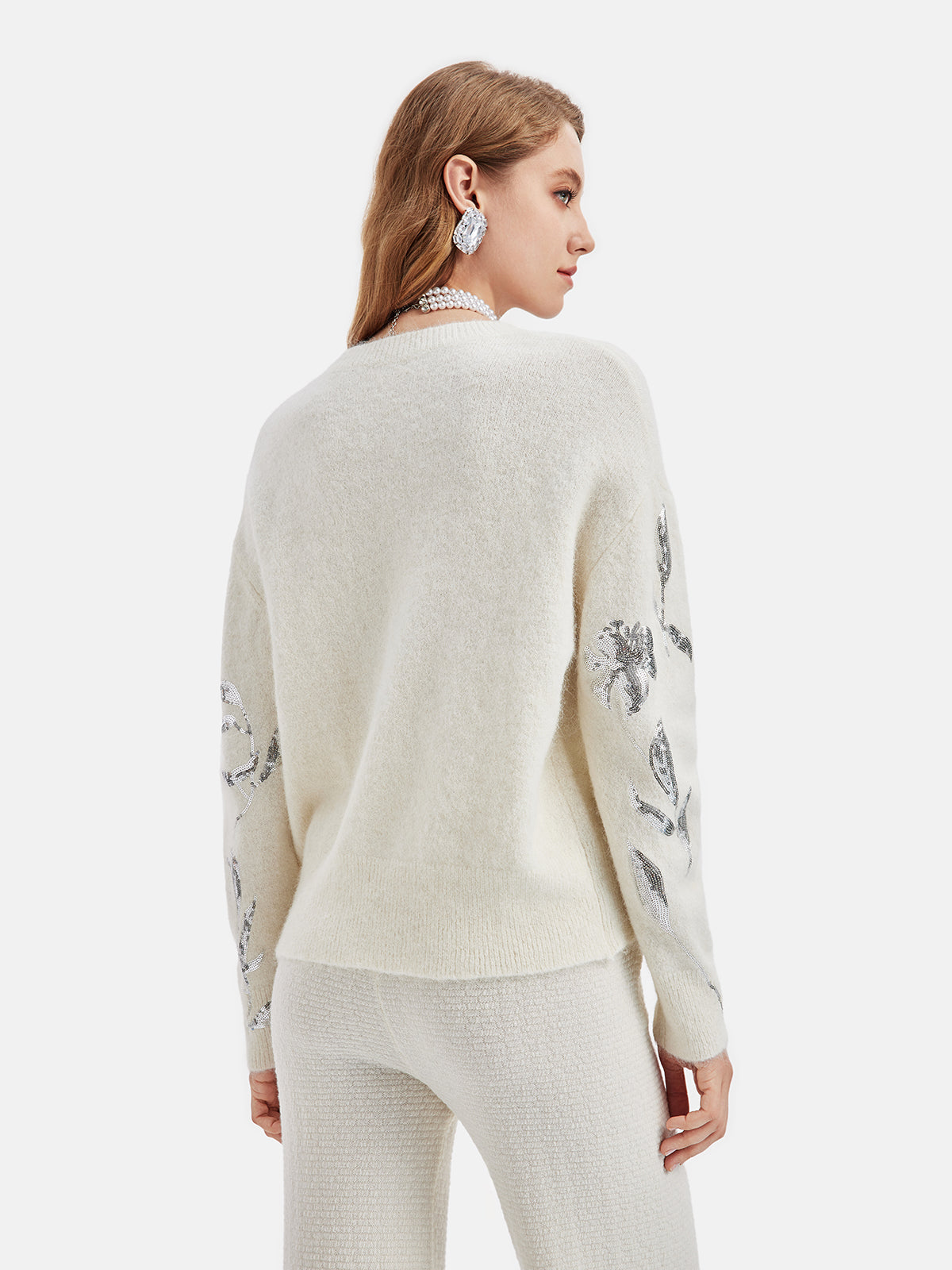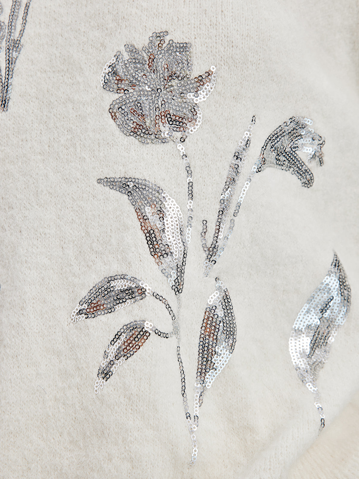 Sweter dzianinowy z haftowanym srebrnym kwiatem
