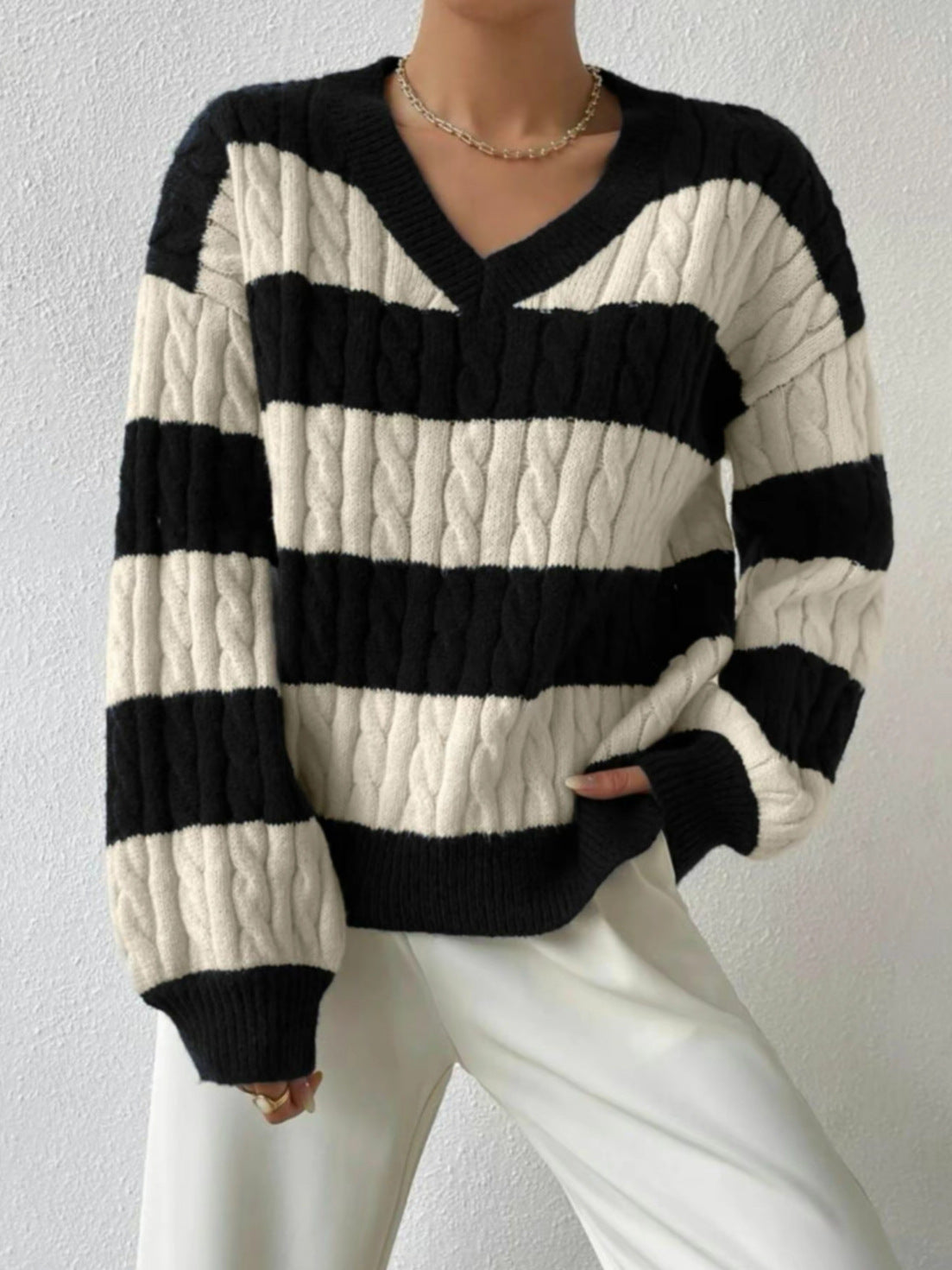 Sweter w paski z dekoltem w serek