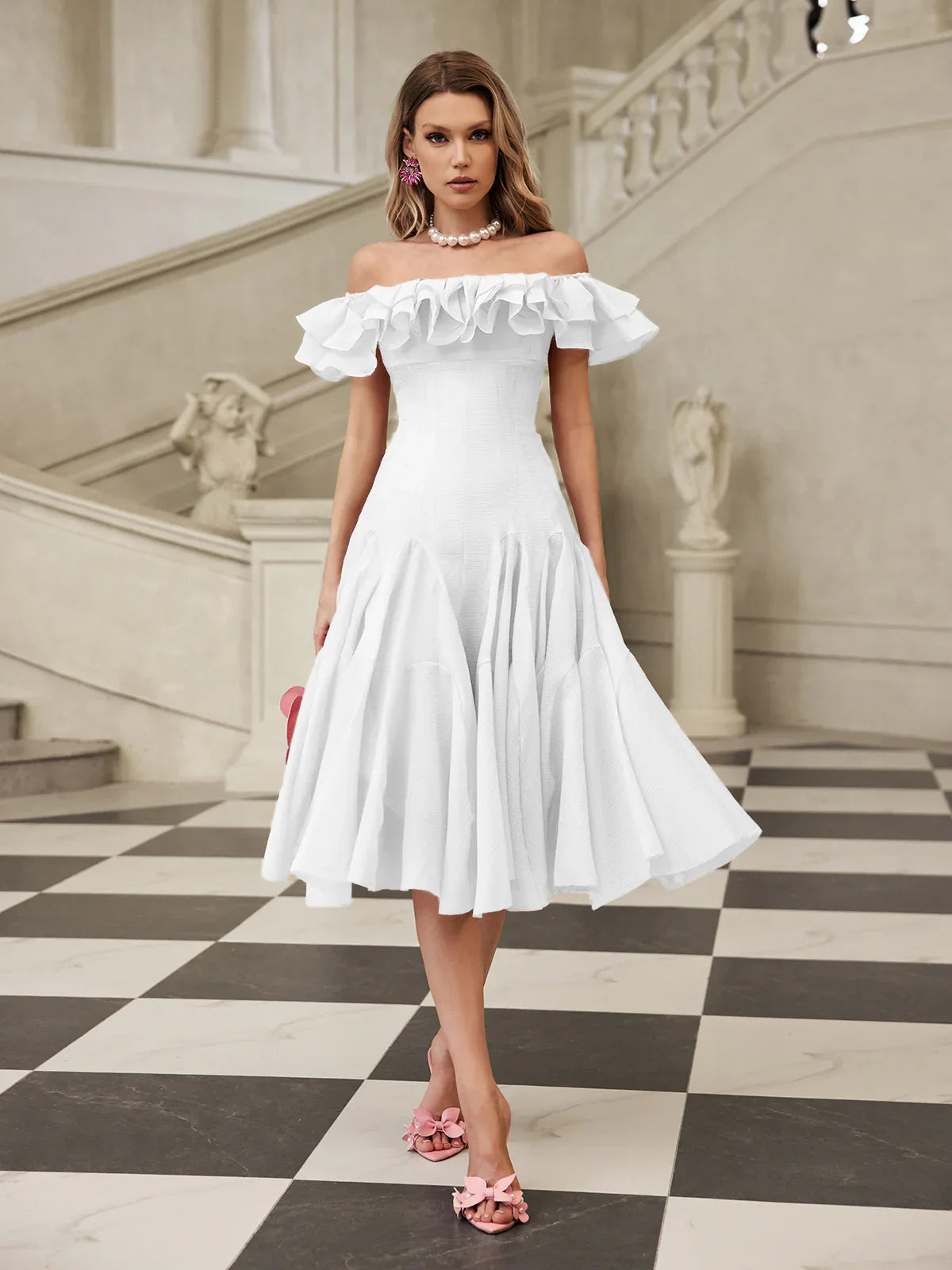 Sukienka midi Amélie z odkrytymi ramionami i falbanką – biała
