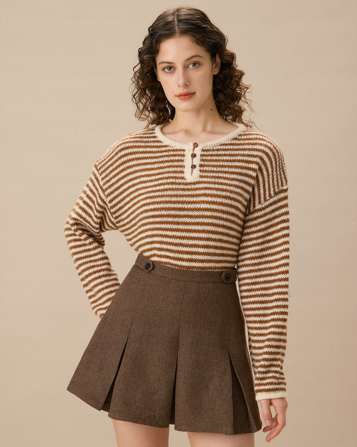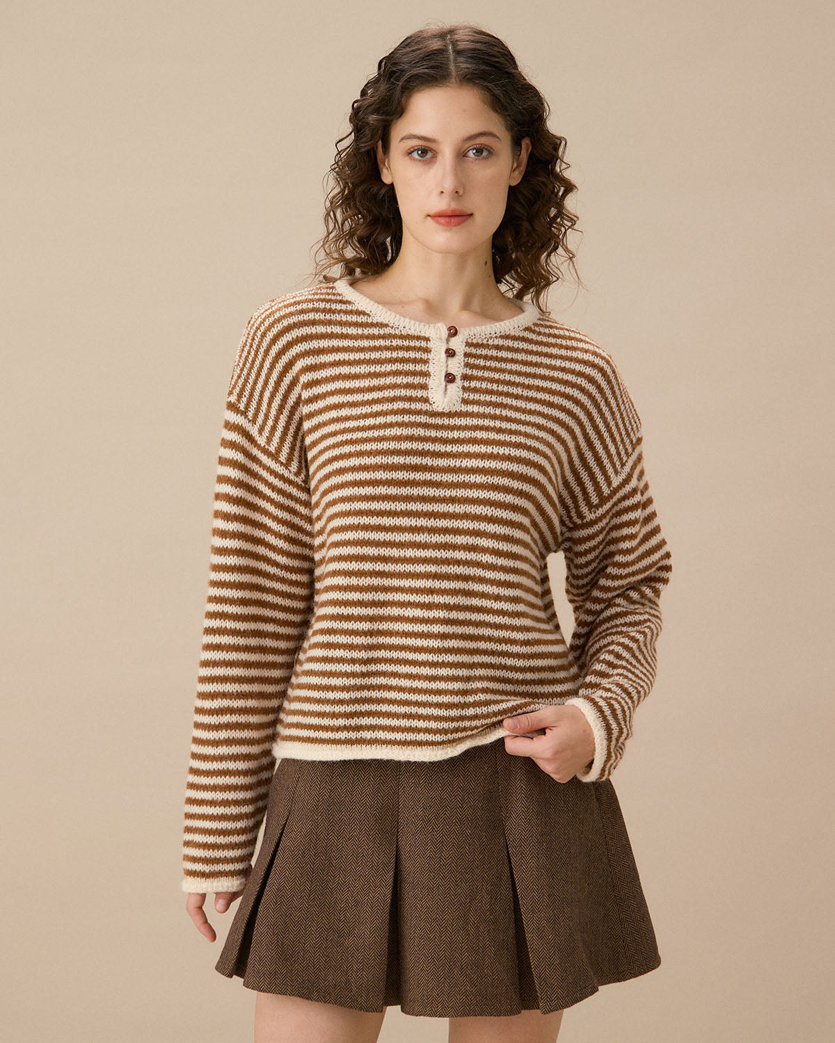 Brązowy sweter w paski z obniżonym dekoltem