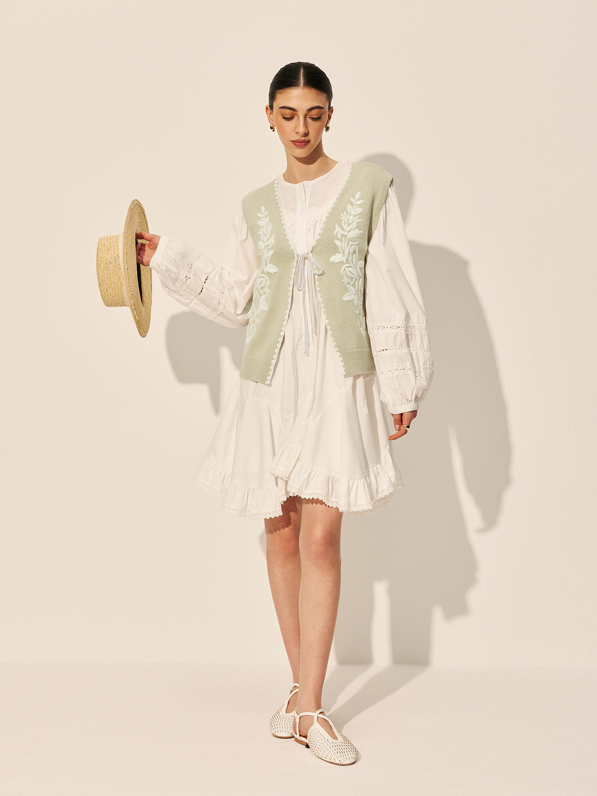 Sweter-kamizelka z haftowaną kokardą i kwiatowym wzorem