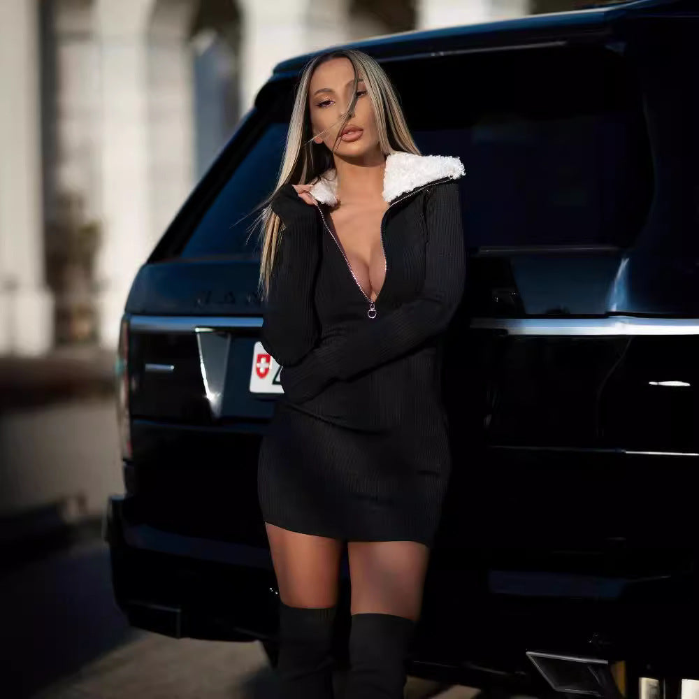 Sukienka mini Oriana z kołnierzykiem z piór i zamkiem błyskawicznym