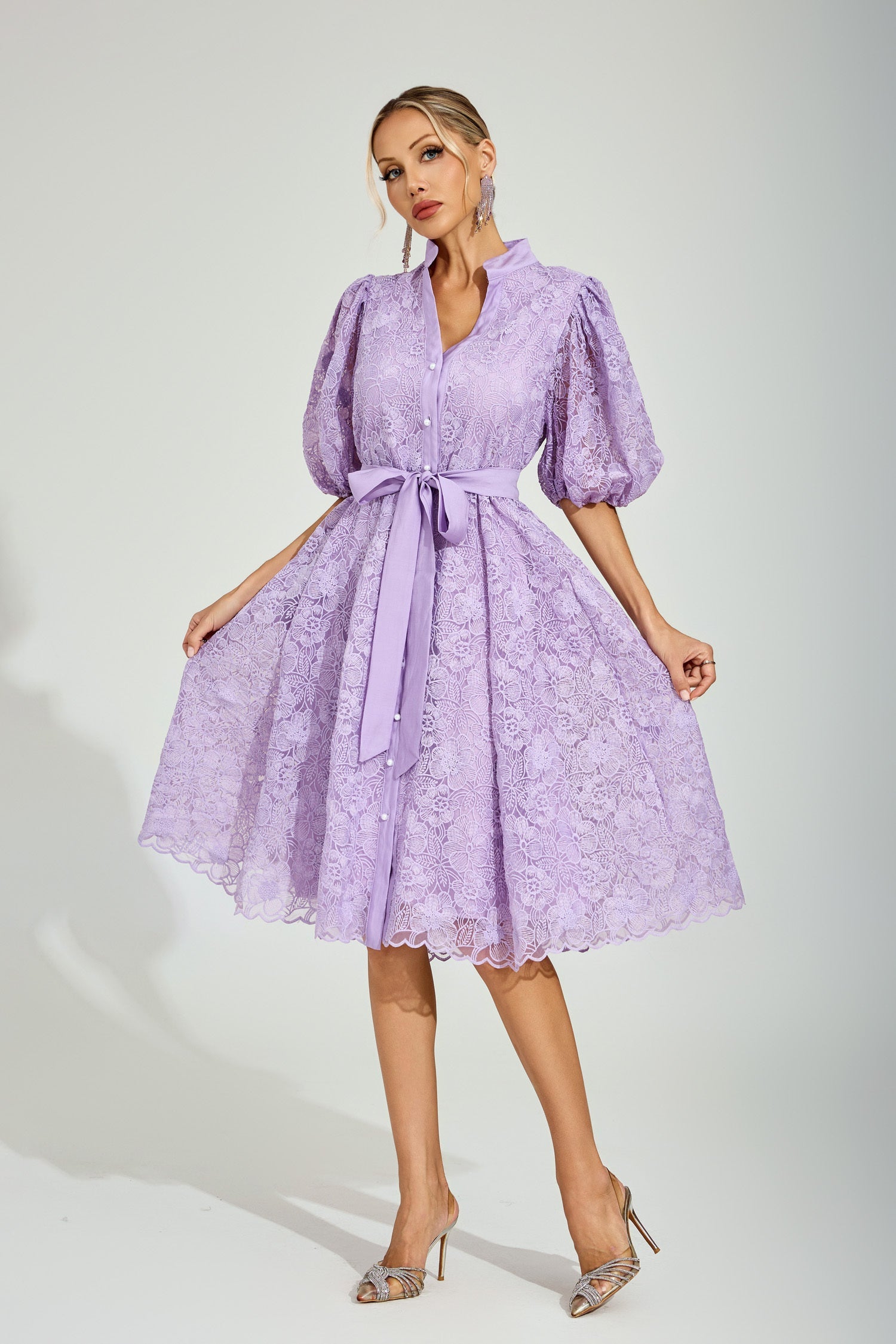 Sukienka midi z koronką w kwiaty bzu