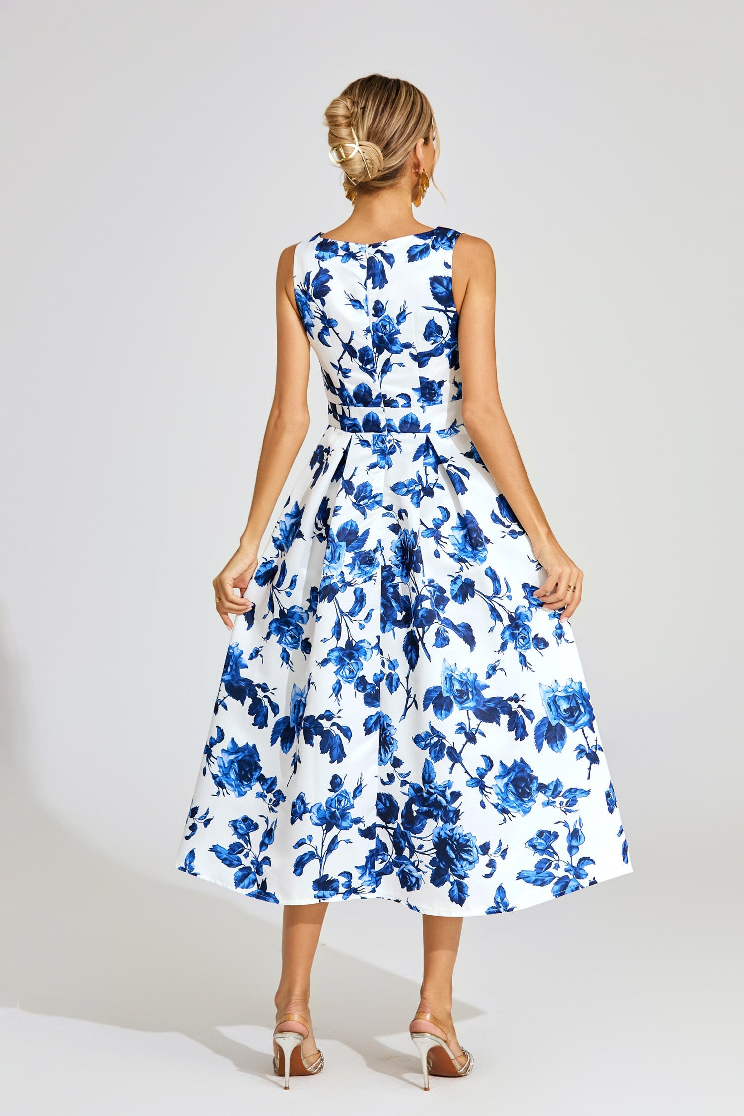 Tasarım Detayları: Kolsuz üst kısım, kayık yaka, beli oturan kesim ve hacimli pileli midi etek. Canlı mavi gül baskısı, beyaz zemin üzerinde zarafet ve incelik katıyor. Kusursuz bir uyum için arka fermuar kapatma.