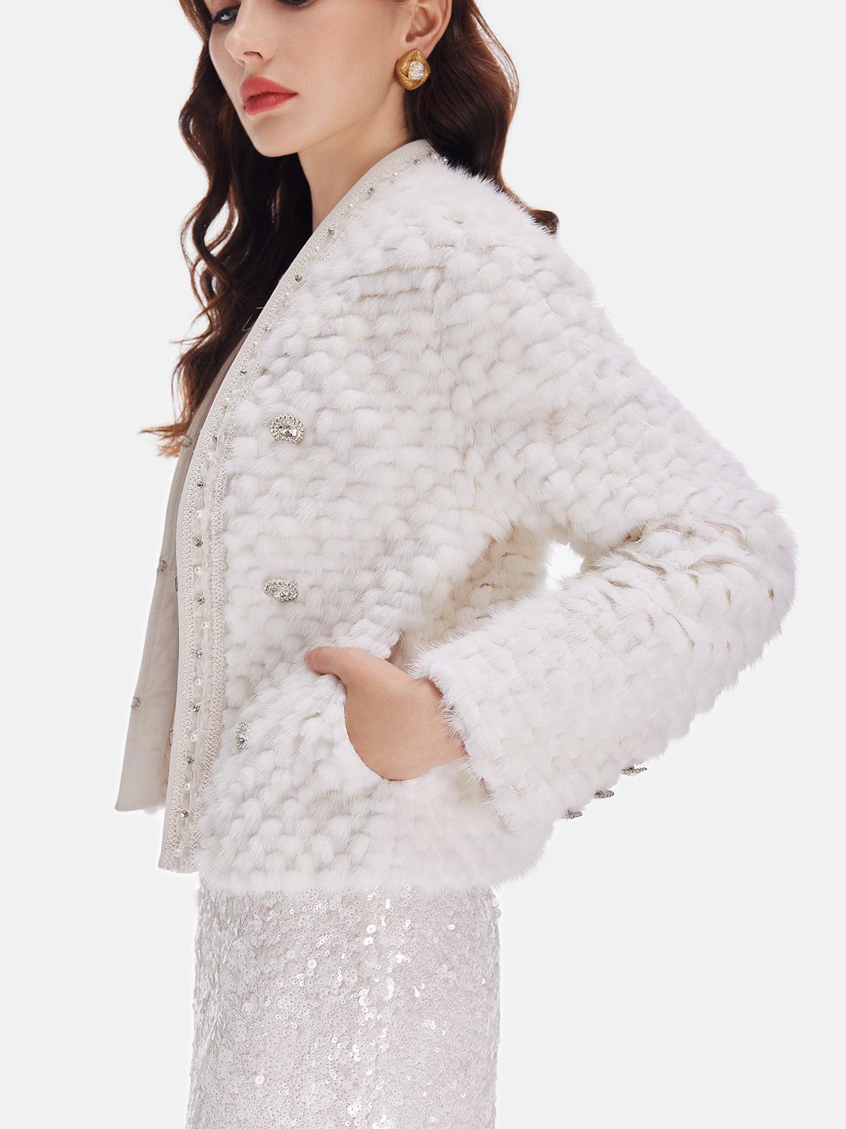 Lüks tasarımıyla öne çıkan bu beyaz kısa ceket, incili detayları ve düğme süslemeleriyle zarafeti yeniden tanımlıyor. Şıklığınızı tamamlamak için özel davetlerde veya günlük kombinlerinizde tercih edebilirsiniz. Hem sıcak tutan dokusuyla hem de göz alıcı görünümüyle stilinize değer katacak!