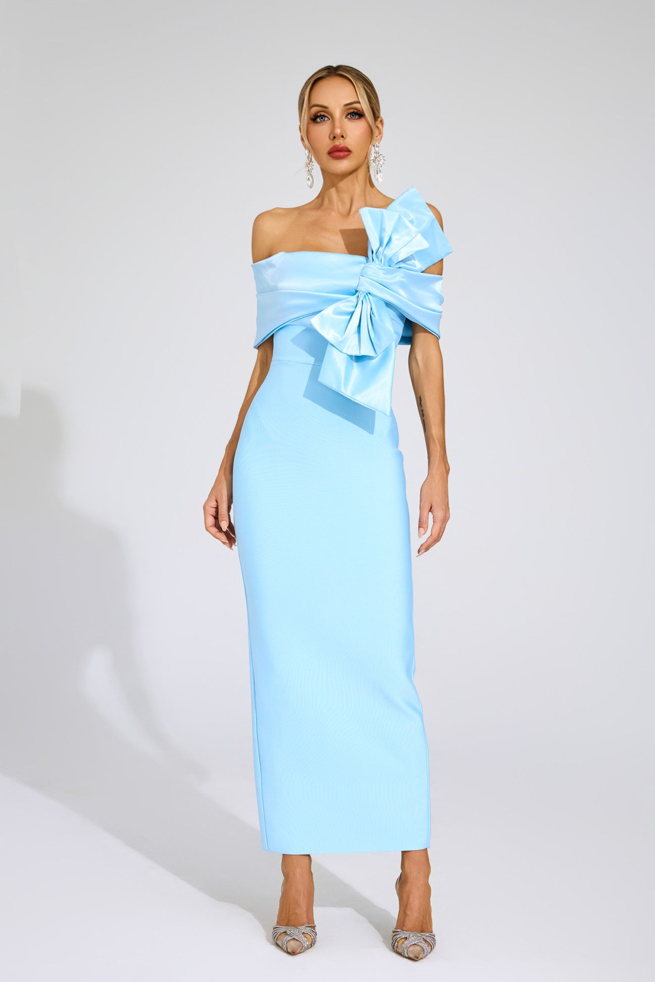 Bu göz alıcı, omuzları açık elbise, göğüs kısmına zarifçe yerleştirilmiş büyük saten fiyonk ile dikkat çekiyor. Vücuda oturan silüeti ve sade çizgileri modern bir görünüm sağlarken, arka yırtmaç hareket ve rahatlık katıyor. Arka fermuar kapatma ise şık bir görünüm sağlıyor.