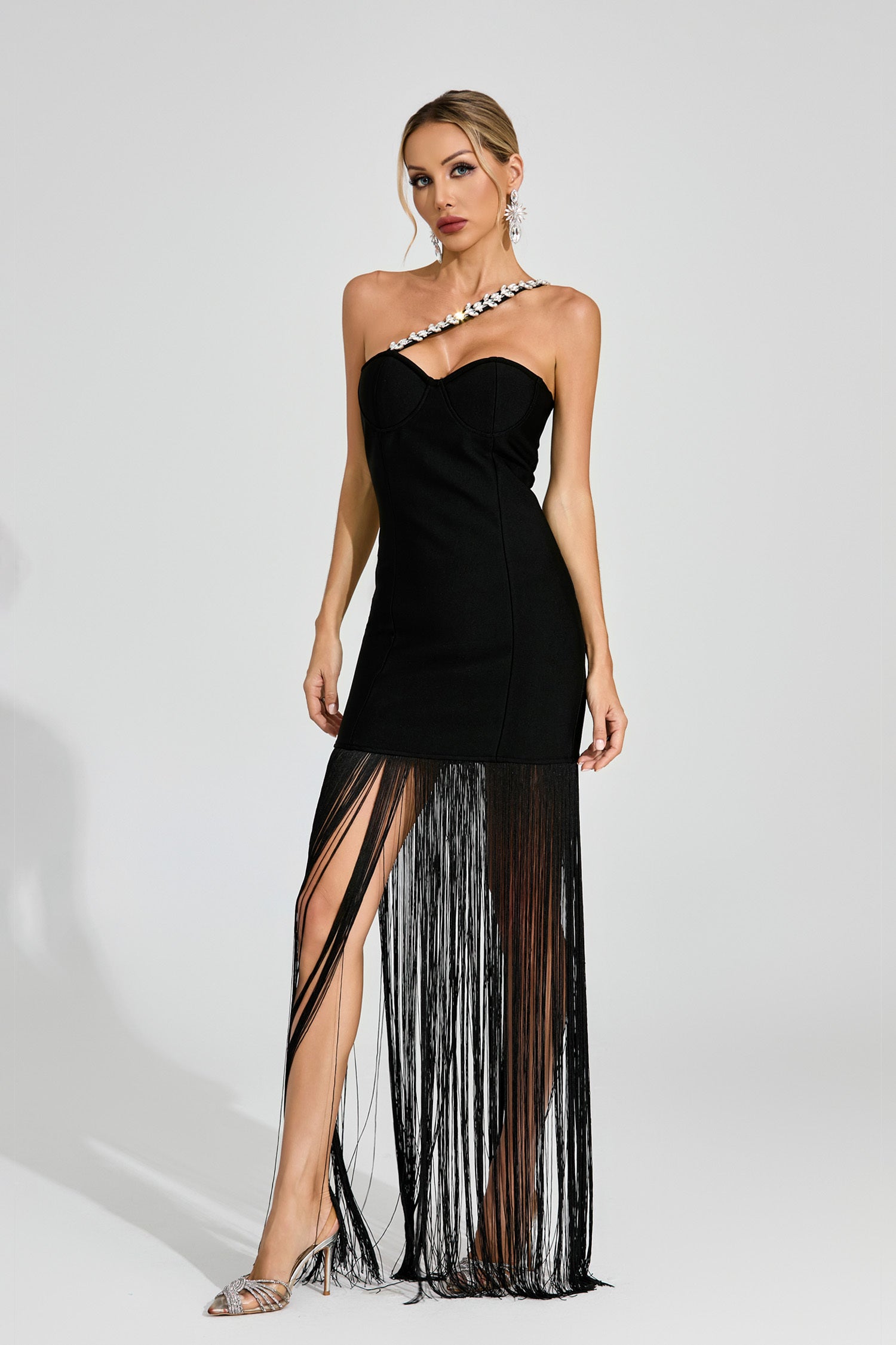 Material: Structured stretch Bandage with crystal-embellished trim and sheer fringe overlay