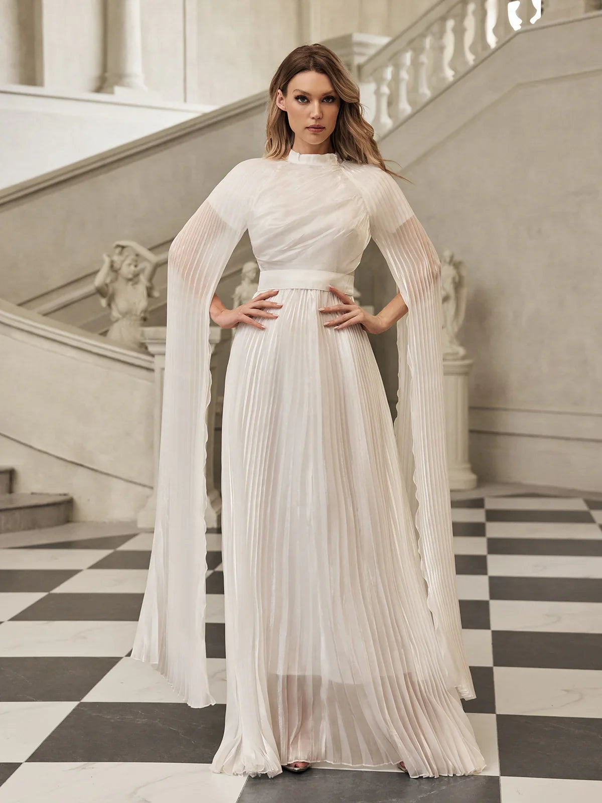 - Fildişi beyazı, pileli şifon elbise, gösterişli kanatlı kollarıyla dikkat çekiyor.