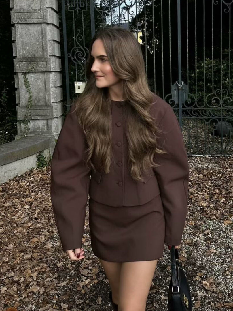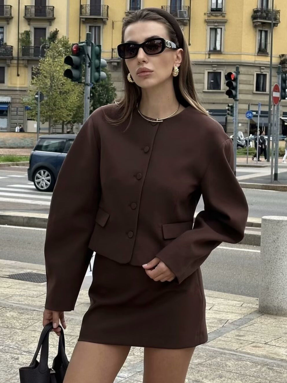 Şıklığı ve modern çizgisiyle dikkat çeken bu takım, minimalist tasarımıyla güçlü bir görünüm sunuyor. Hem ofis stilinizde hem de özel davetlerde zarif bir tercih olabilir.