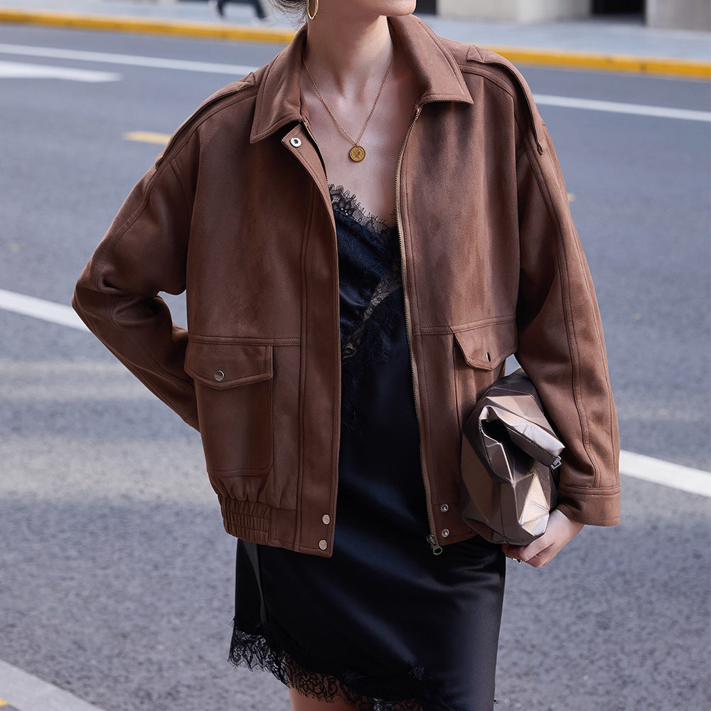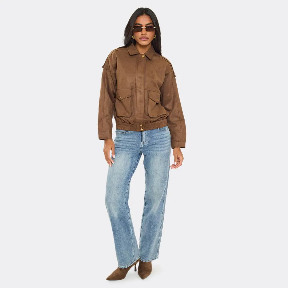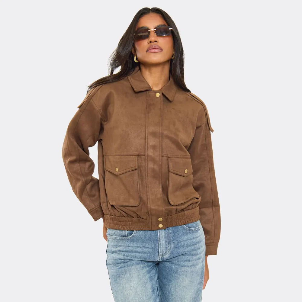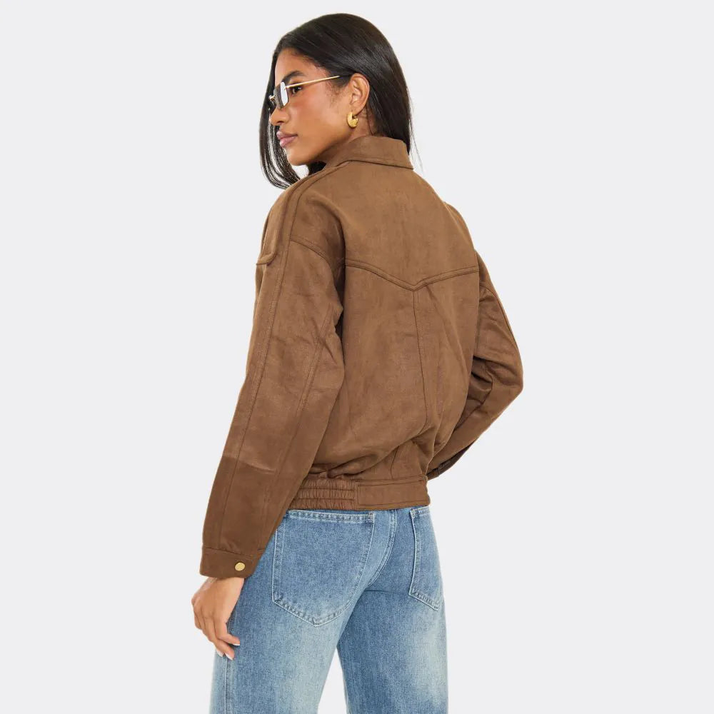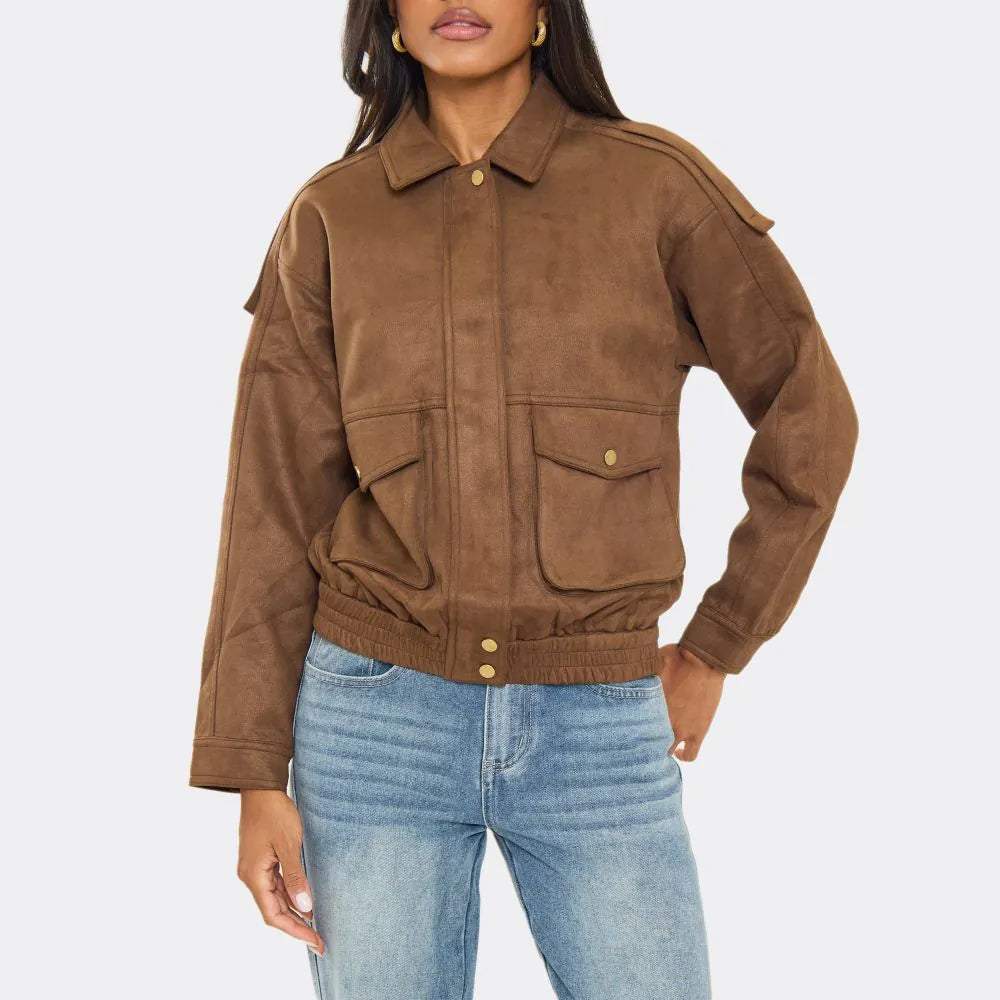 Modern şehir stiline uygun tasarımıyla dikkat çeken bu süet görünümlü ceket, hem şıklık hem de rahatlık sunar. Büyük cepleri ve elastik etek ucu sayesinde fonksiyonel bir kullanım sağlarken, kahverengi tonu her kombine kolayca uyum sağlar.