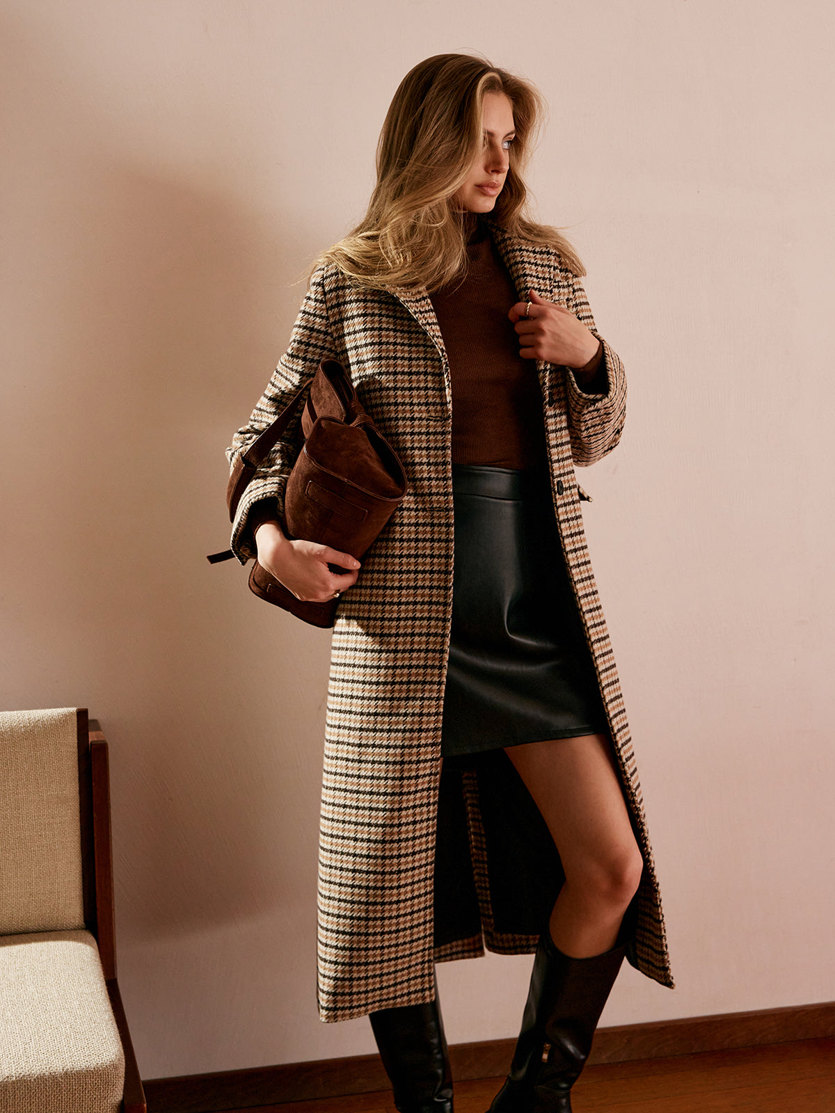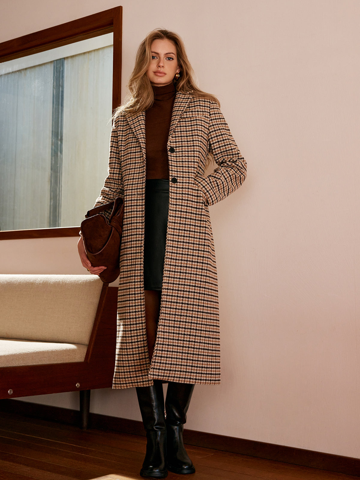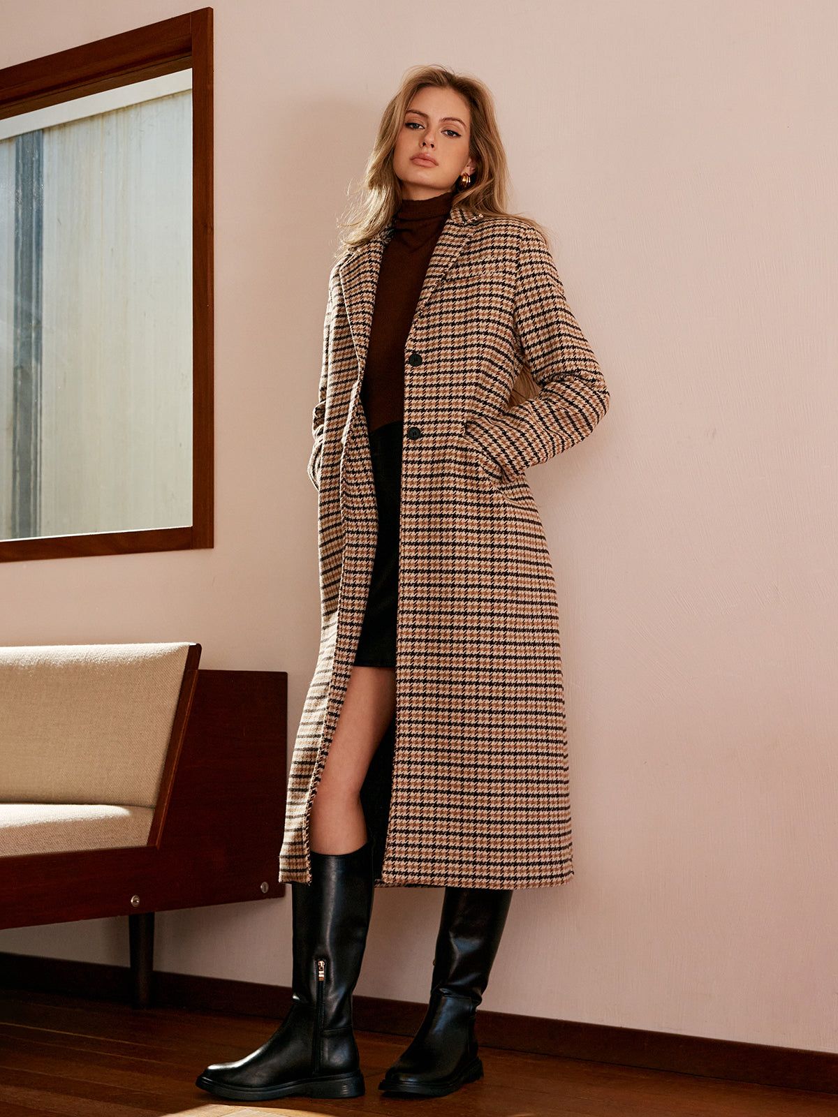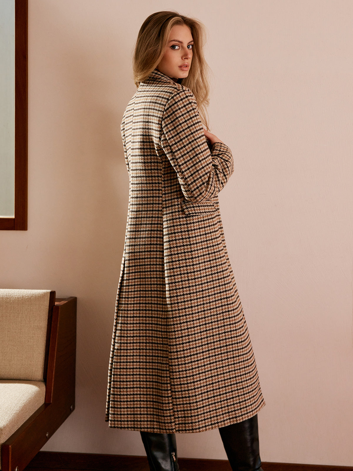 Şık Kare Desenli Düğmeli Uzun Palto