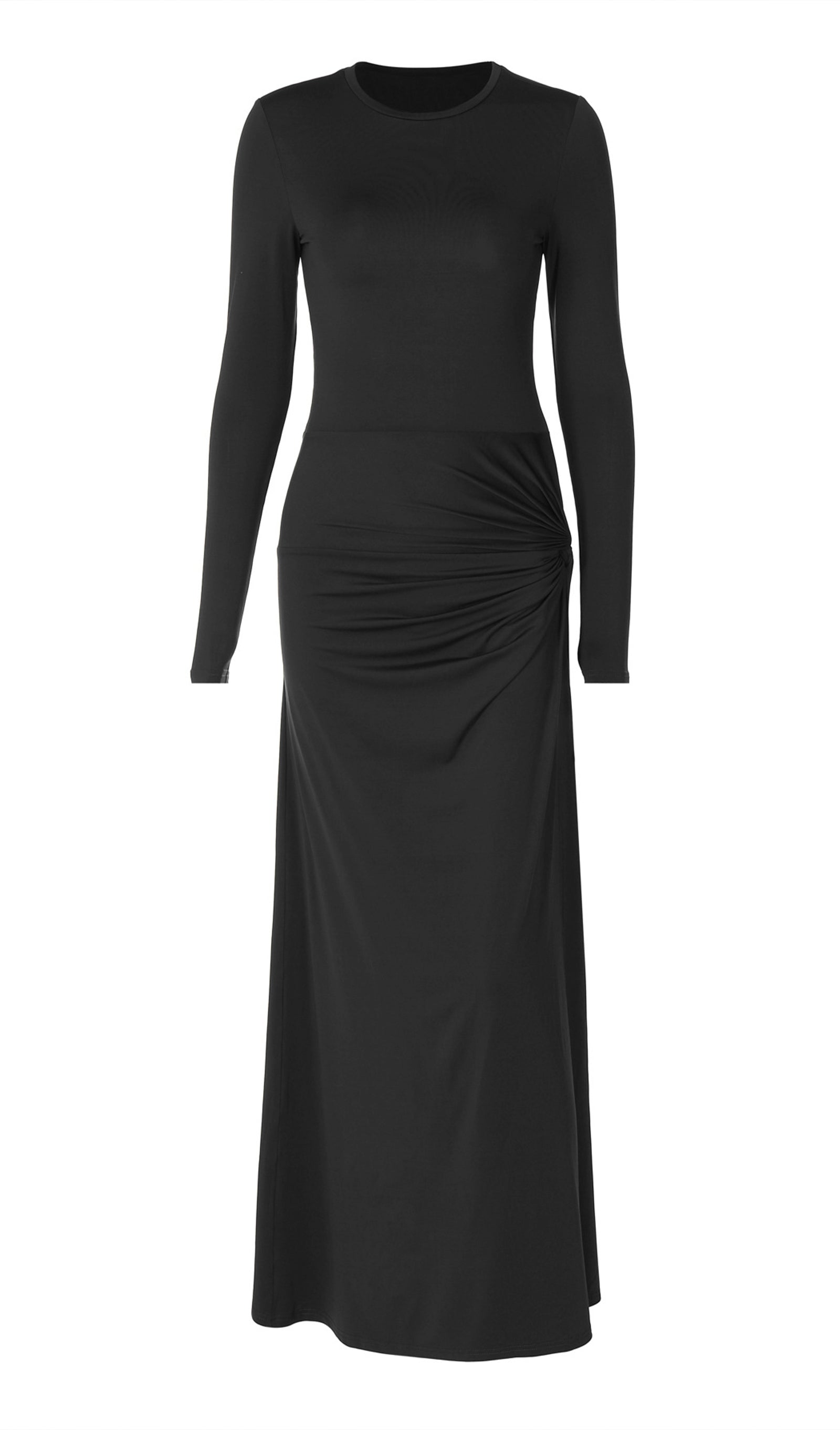 Drapeli Jersey Yırtmaçlı Maksi Elbise-Siyah