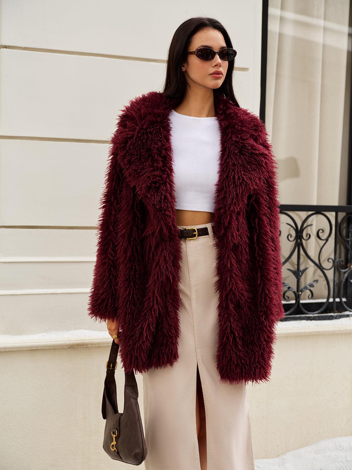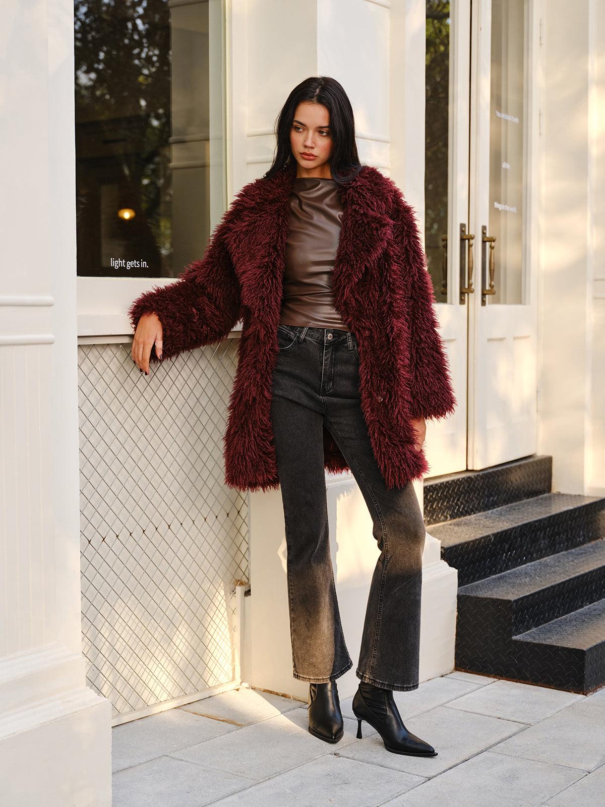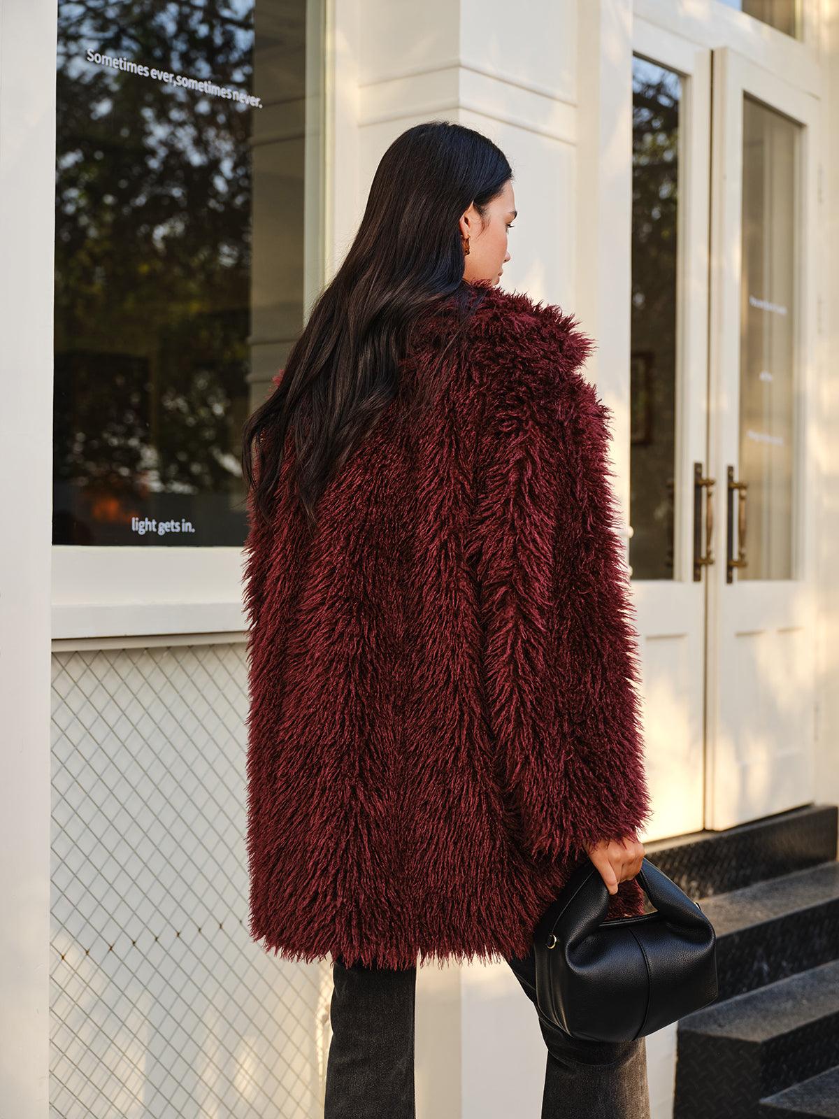 Yumuşak dokusu ve bordo rengiyle lüks bir görünüm sunan bu tüylü kürk ceket, kış stilinizi yükseltecek bir parça. Hem casual hem de özel kombinler için göz alıcı bir seçim!