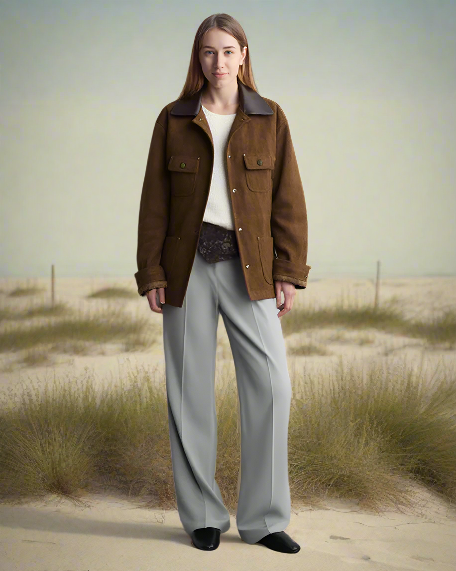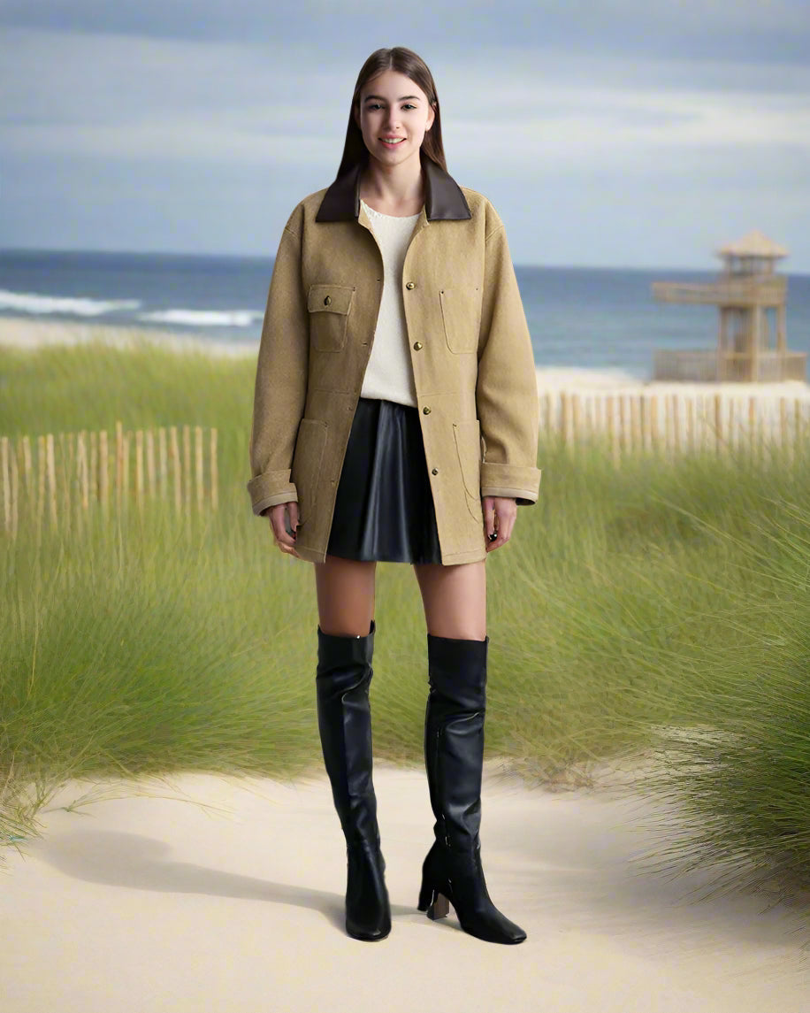 Ashore Shop'un doğrudan fabrikadan satışa sunduğu kadın kanvas berber polar astarlı palto, kullanışlı dayanıklılığı sıcacık bir görünümle birleştiriyor. Yumuşak bej tonunda sağlam kanvastan üretilen palto, yalıtım ve konfor için peluş polar astarla kaplanmıştır, bu da onu geçiş mevsimleri veya soğuk mevsimler için ideal hale getirir. Tasarım, ön kısımda pratik yama cepleri bulunan yapılandırılmış bir silüete sahiptir ve hem işlevsellik hem de iş kıyafetlerinden ilham alan bir çekicilik katmaktadır. Kontrast oluşturan koyu deri yaka, görünümü yükselterek, sağlam karakterine incelikli bir dokunuş getiriyor. Düğme kapamaları ve ayarlanabilir manşetleriyle tamamlanan bu palto, pratiklik ve sade zarafet arasında mükemmel bir denge kuruyor.