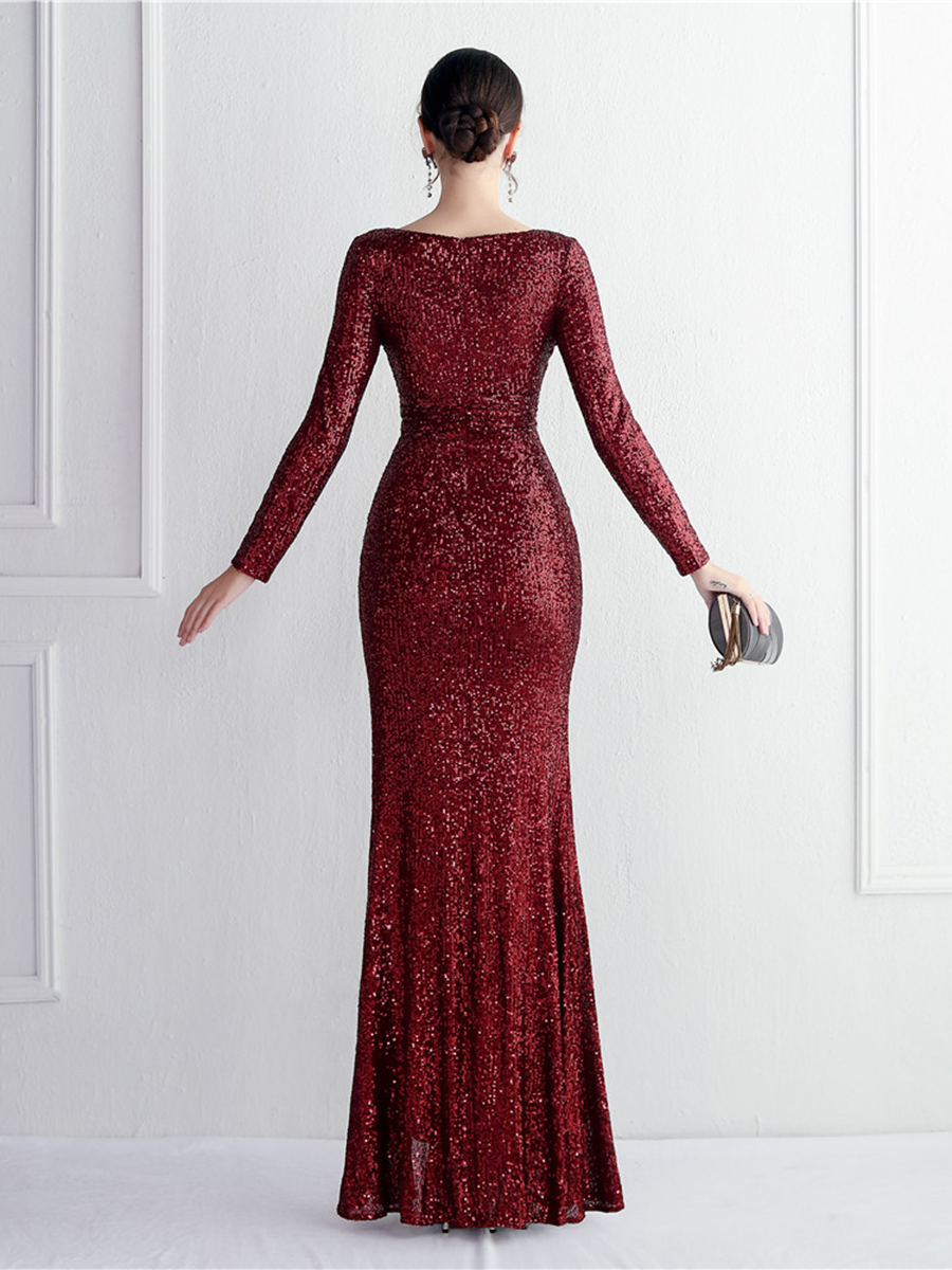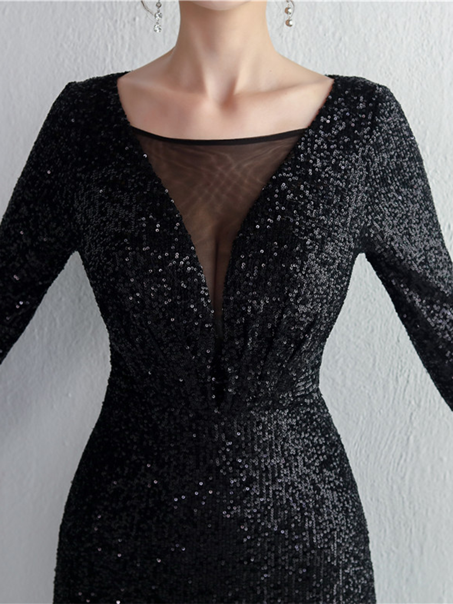 Bu resmi, V yakalı, payetli yeşil balo elbisesi, her etkinlikte öne çıkmanızı sağlamak için tasarlandı. Uzun kolları ve yüksek yırtmacı hem zarafet hem de rahatlık sunuyor. Göz alıcı ve sofistike bir görünüm için mükemmel.