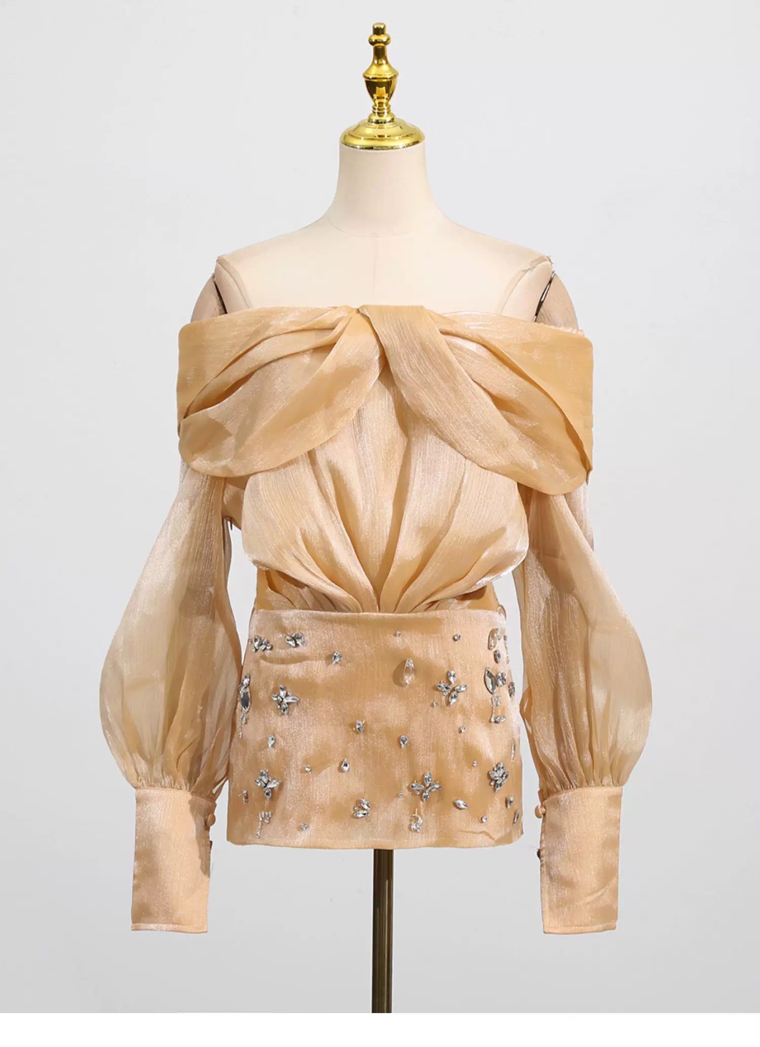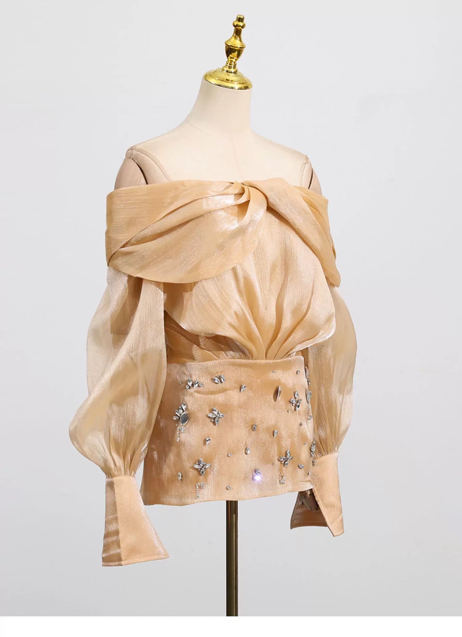 - Omuzları açıkta bırakan, çapraz drapeli, şeffaf parıltılı yaka.