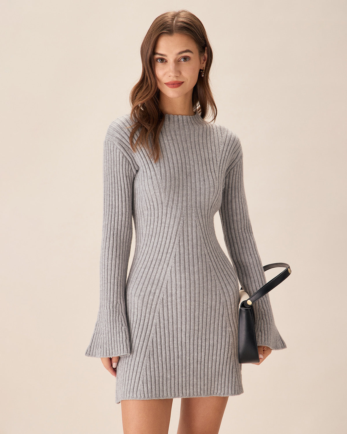 Gri Bisiklet Yaka Çan Kollu Örme Mini Elbise