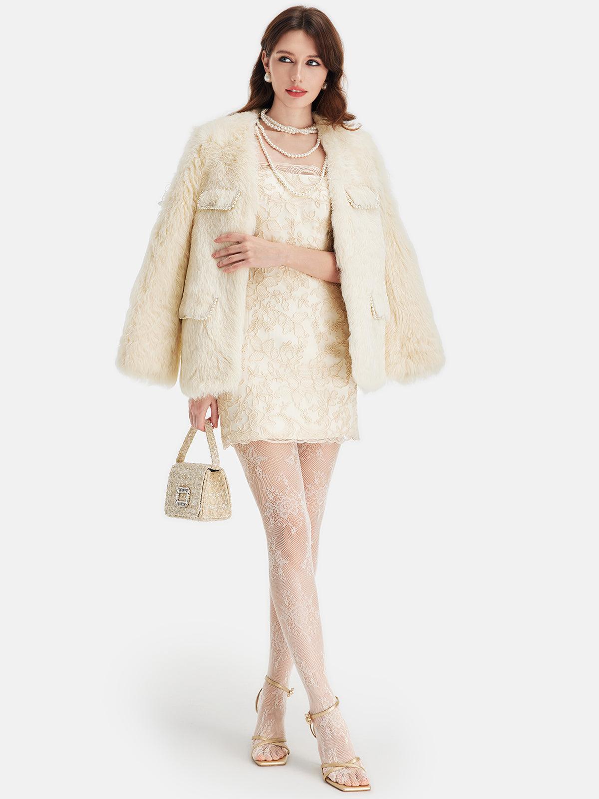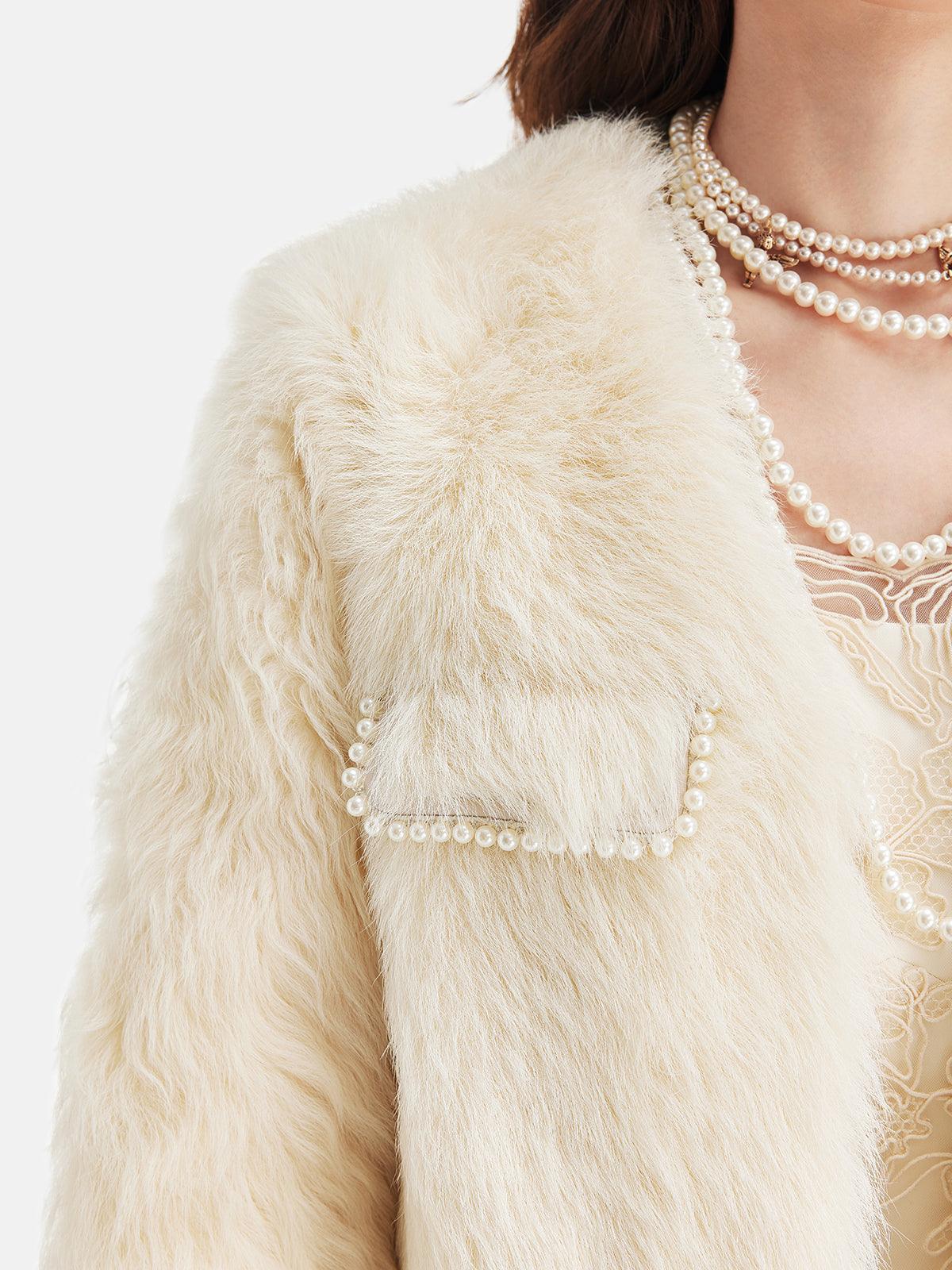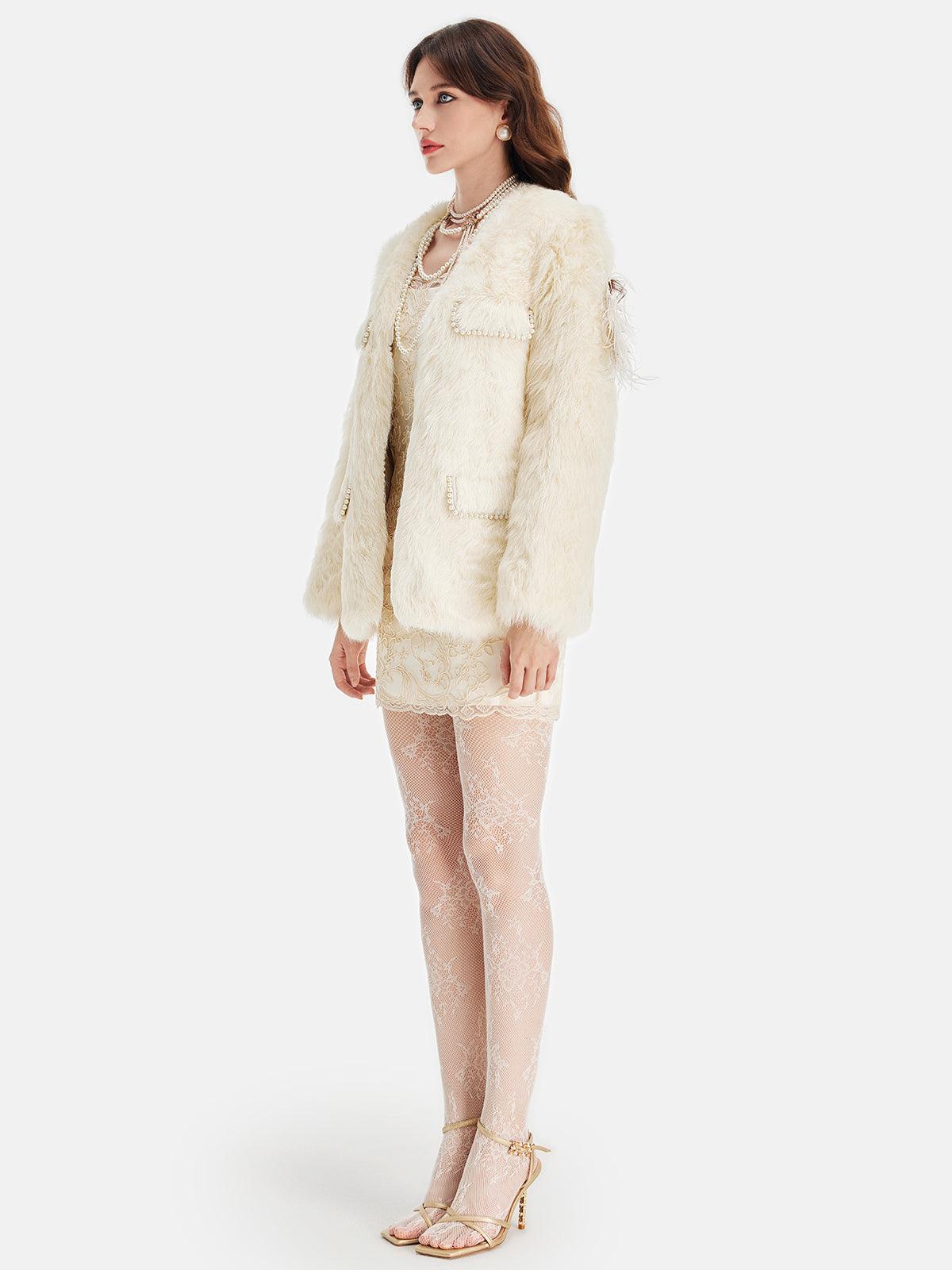 İncili Cep Detaylı Krem Kürk Ceket