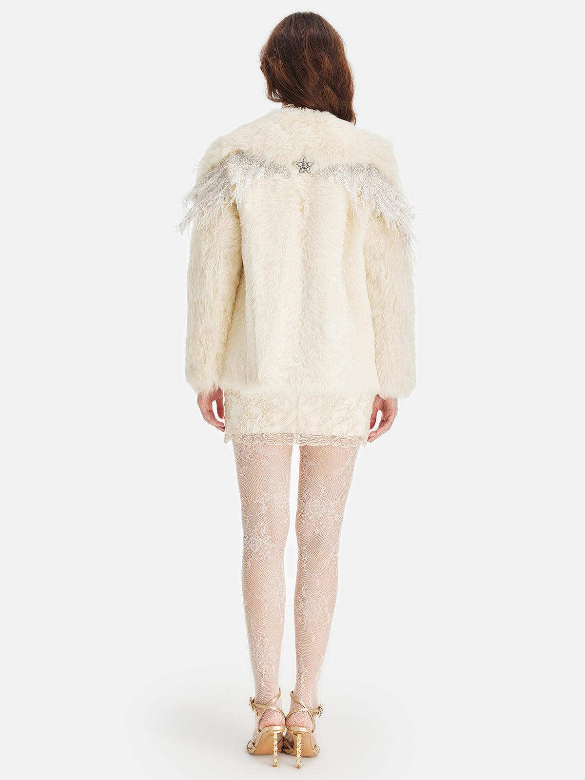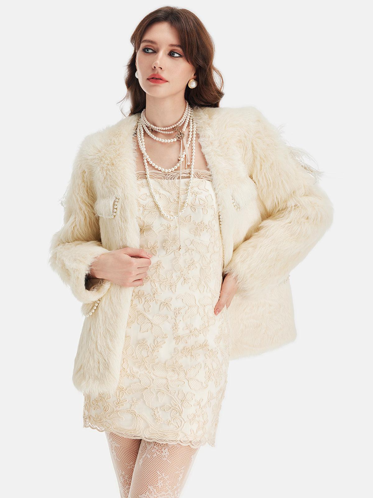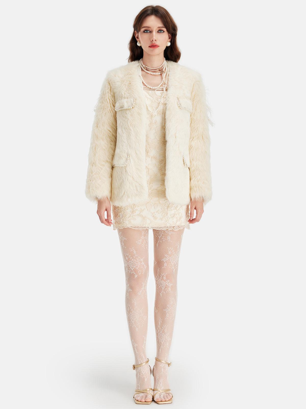 İncili Cep Detaylı Krem Kürk Ceket