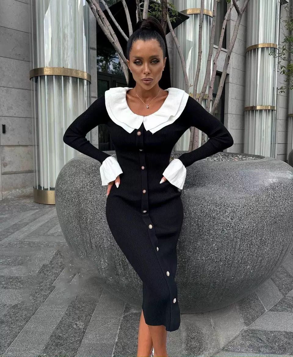 Vintage esintiler taşıyan bu zarif midi elbise, daldırmalı V yaka, uzun dar kollar ve zarif bir görünüm için ön kısmında altın tonlarında düğmelerle tasarlanmıştır. Ribana örgülü jarseden üretilen bu parça, kontrast tonda fırfırlı yaka ve kloş manşetlerle detaylandırılmıştır.