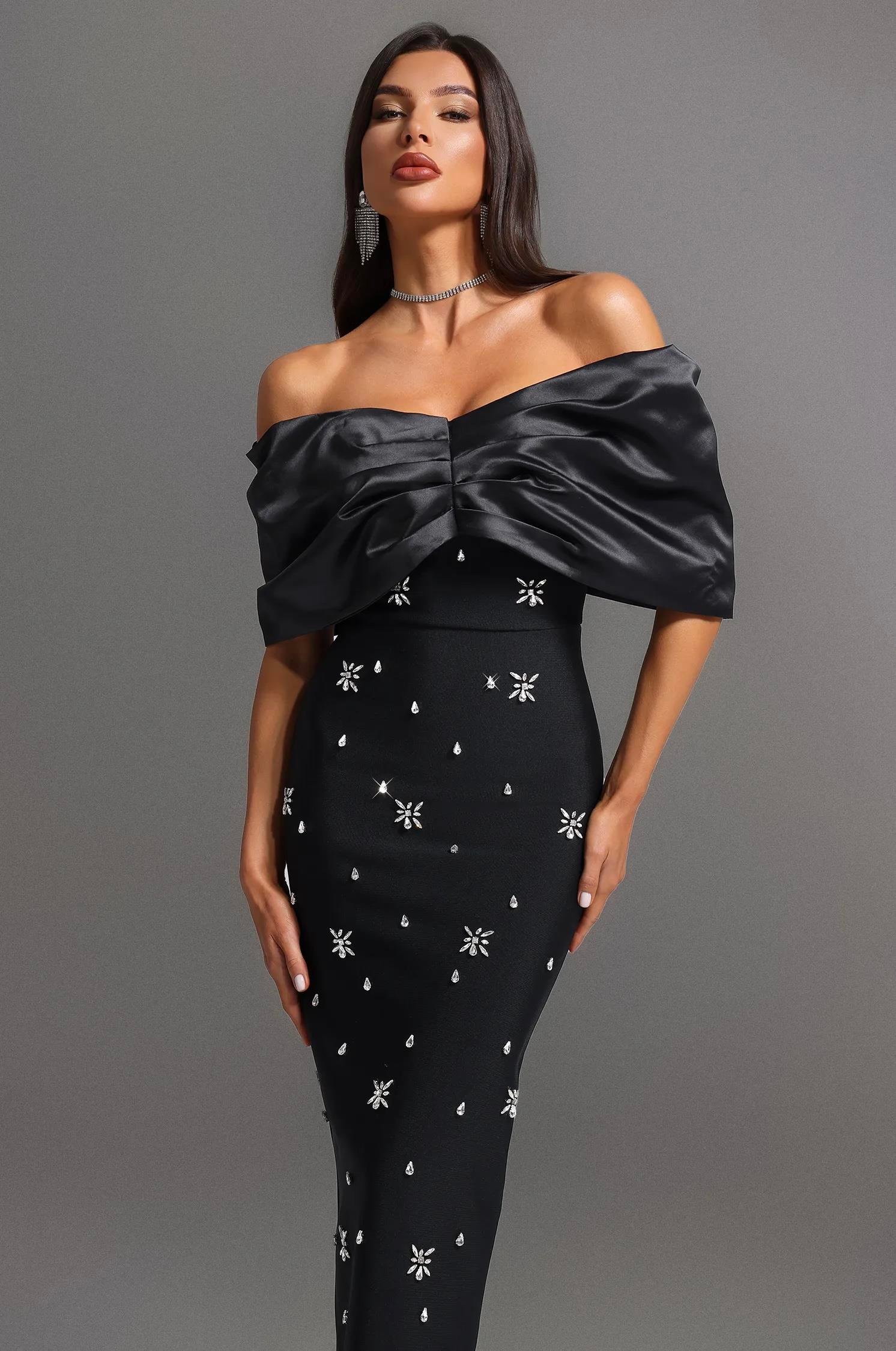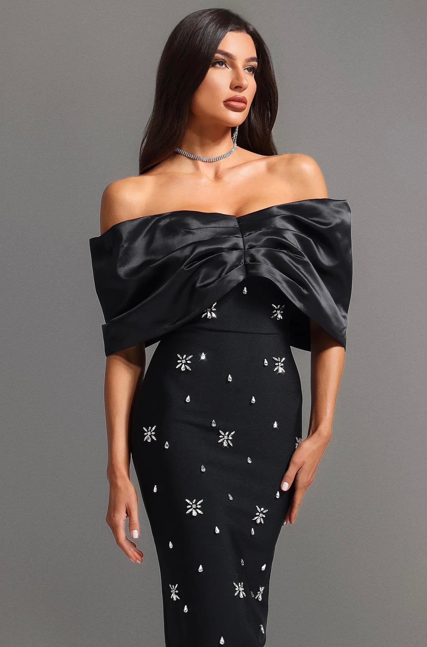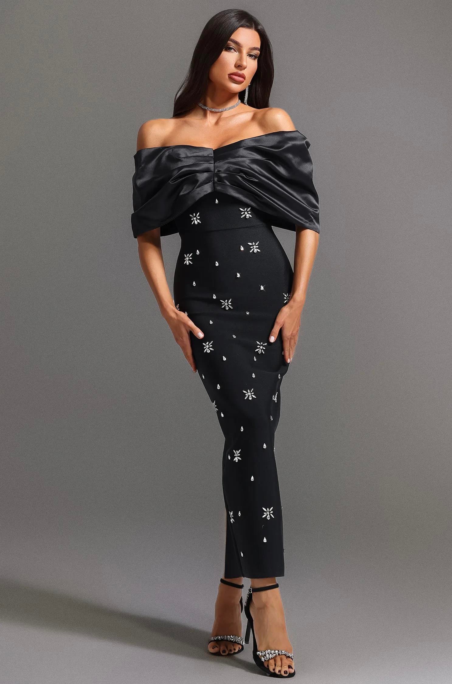 Cemlly Kristal Taşlı Siyah Maxi Elbise