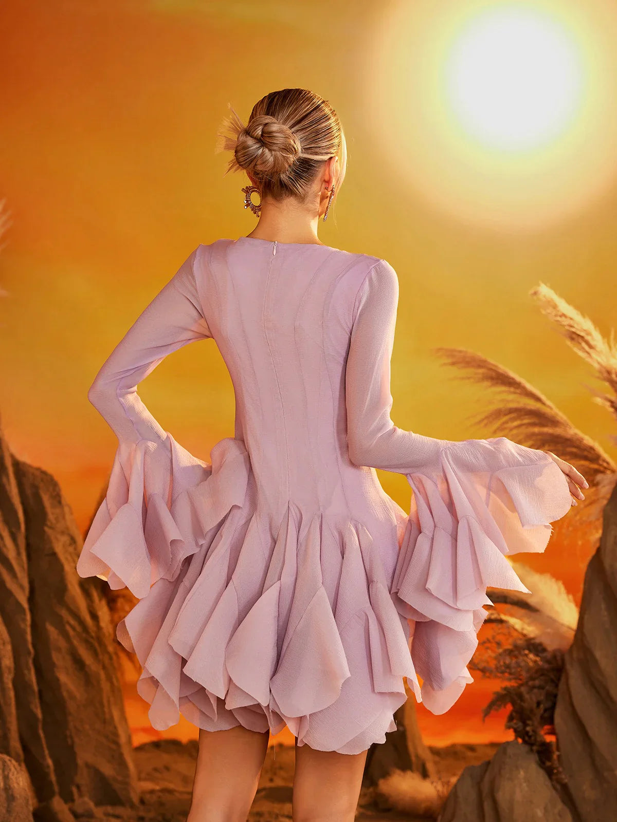 Hem neşeli hem de romantik bir mini elbise; önünde zarif düğmeler bulunan, vücuda oturan bir korsajı ve abartılı fırfırlı geniş kolları var. Etek, dramatik bir hareketlilik için katmanlı, dökümlü fırfırlarla zenginleştirilmişken, arka kısım sade bir silüeti koruyor. Kumaşın yumuşak lavanta tonu, rüya gibi, feminen bir dokunuş katıyor.