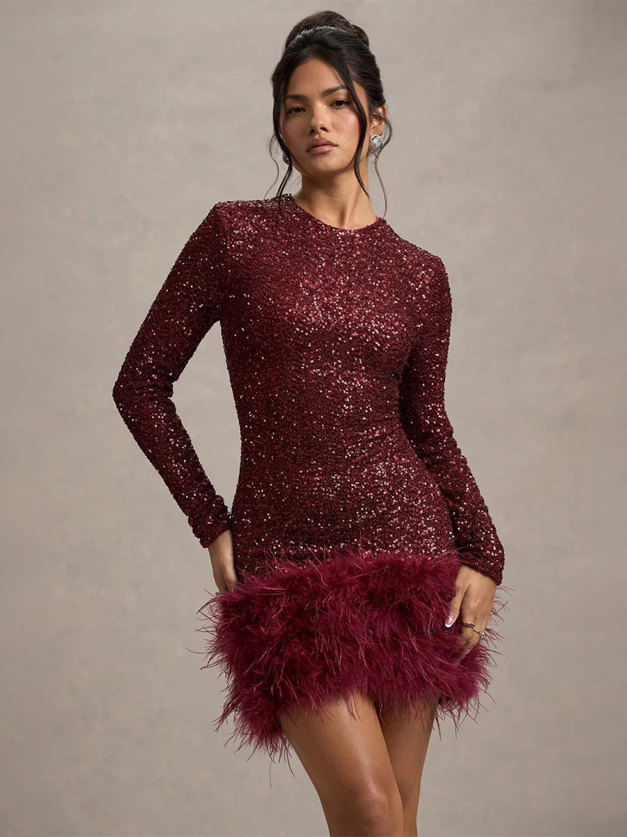 Calixta Uzun Kollu Payetli Tüy Mini Elbise