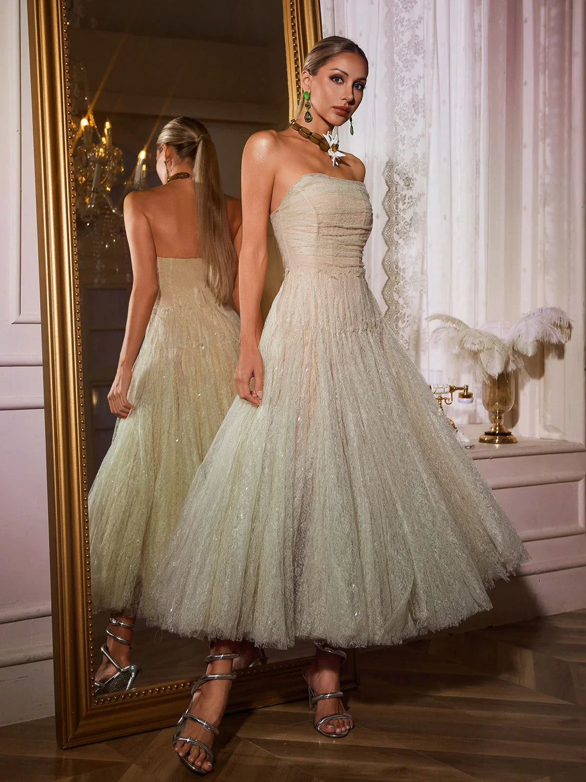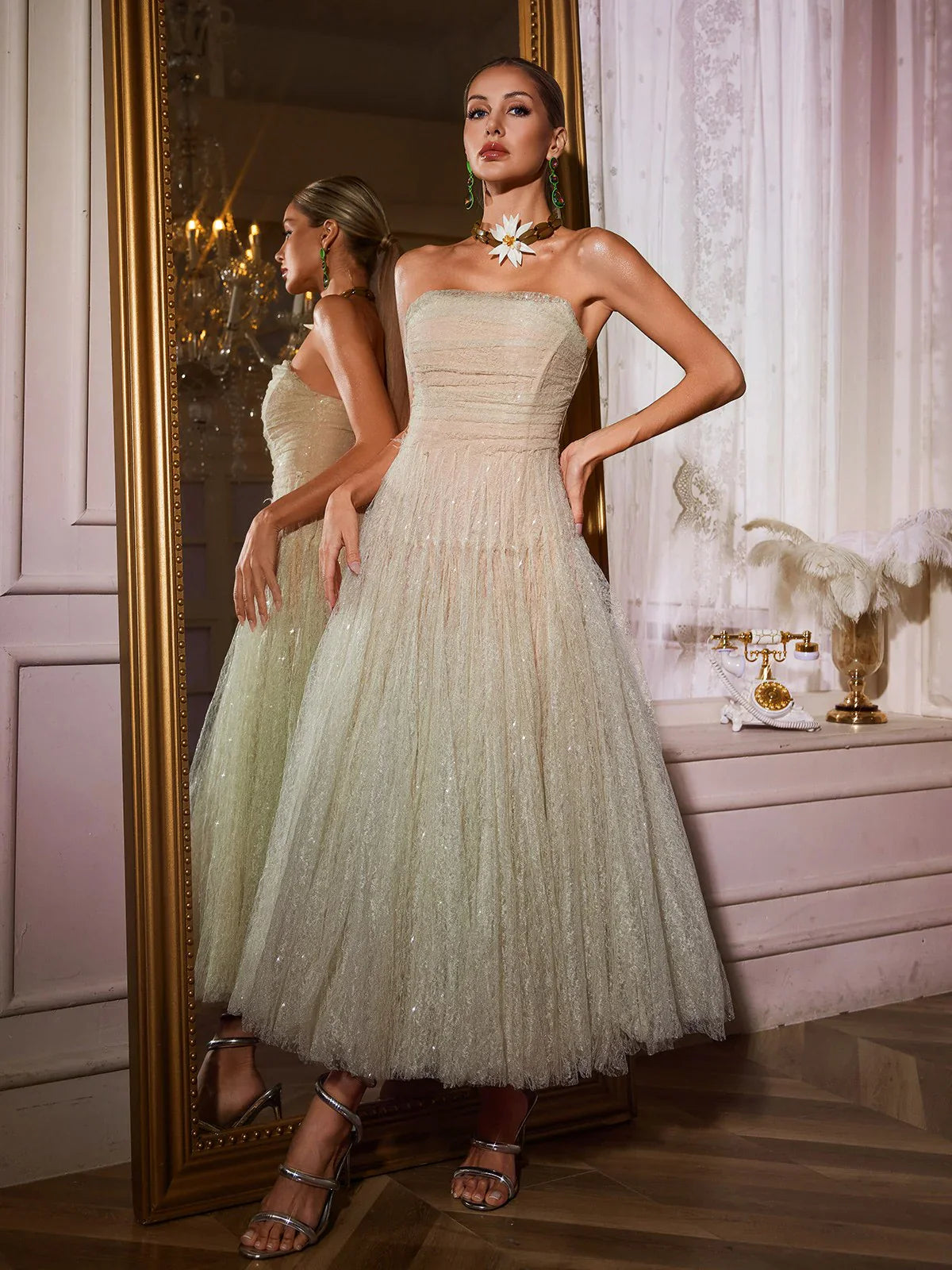 Stil Önerisi: Büyüleyici ve ışıltılı bir görünüm için metalik bantlı topuklu ayakkabılar ve gösterişli takılarla kombinleyin.