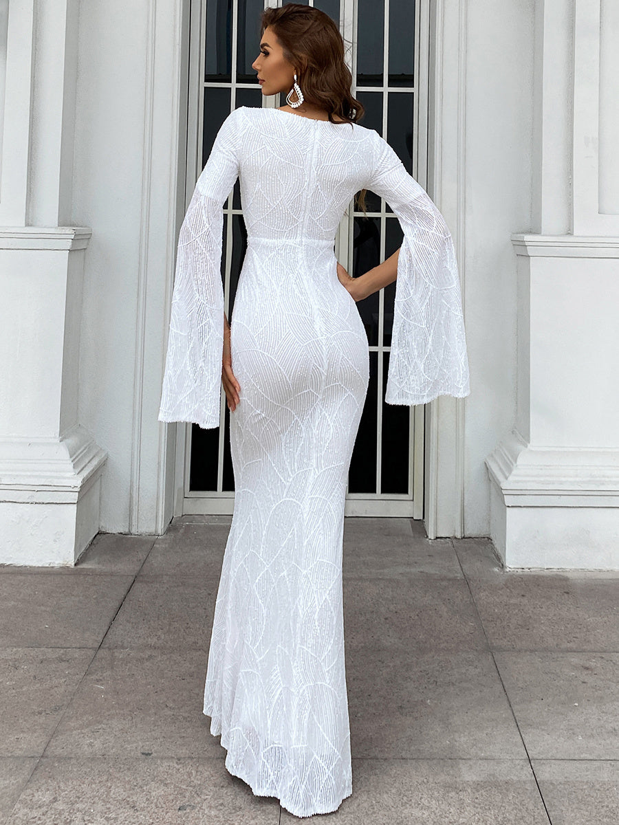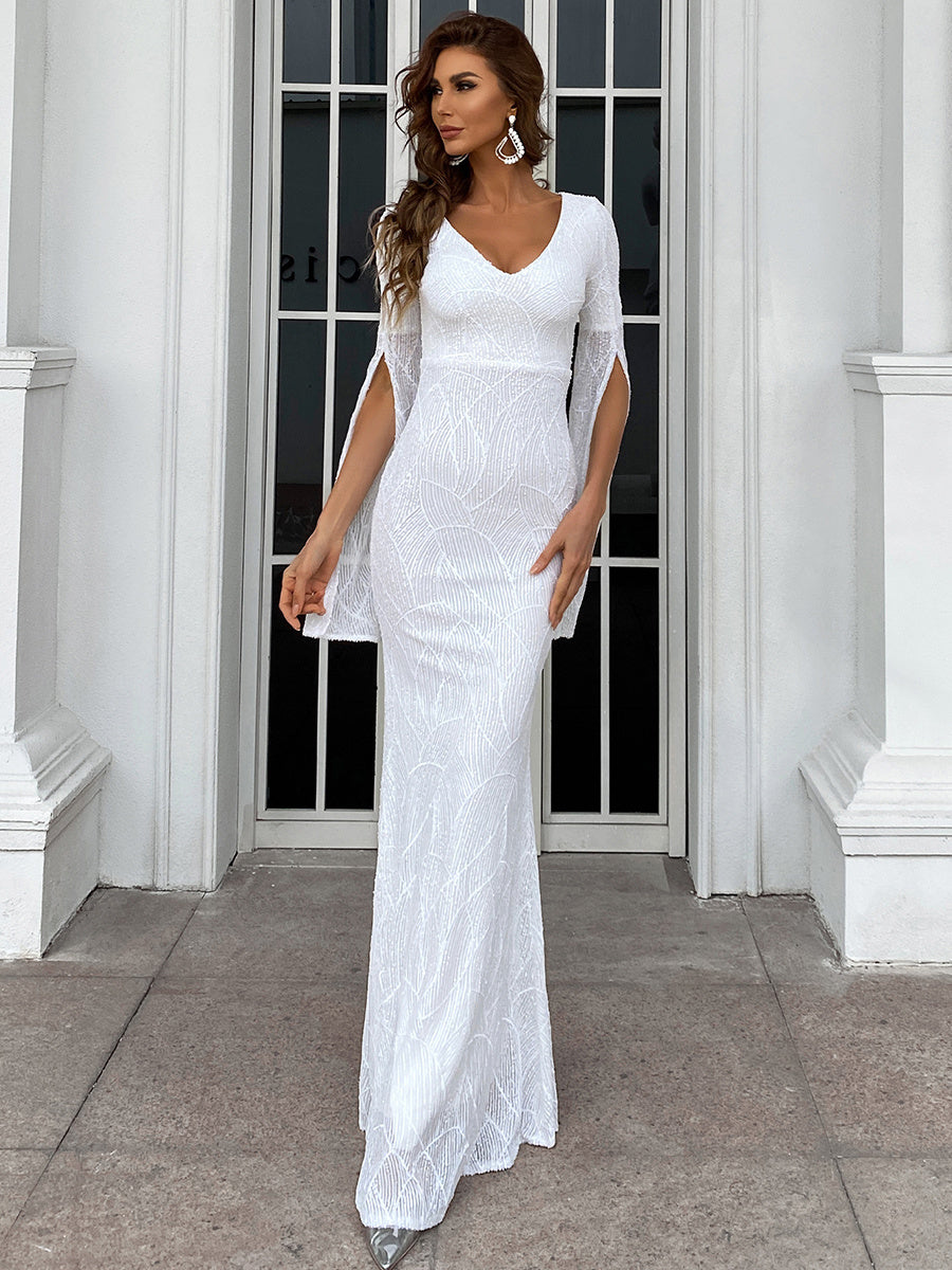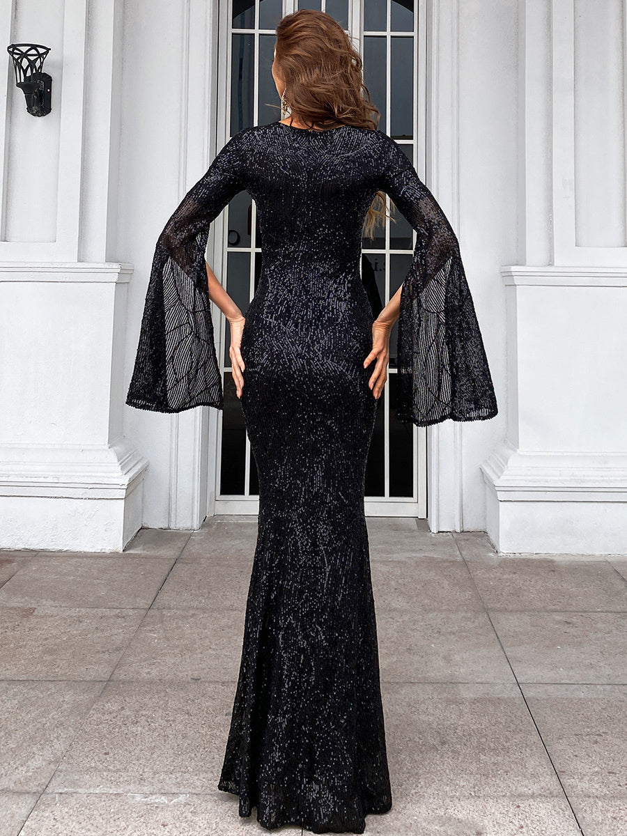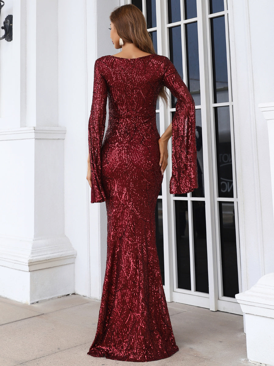 Payet işlemeli, yırtmaçlı kollu denizkızı kesimli balo elbisesiyle göz kamaştırıcı bir giriş yapın. Işıltılı payetler ışığı muhteşem bir şekilde yansıtırken, zarif V yaka boyun çizginizi sofistike bir şekilde çerçeveliyor. Eşsiz yırtmaçlı kolları, klasik denizkızı silüetine modern bir dokunuş katıyor ve kıvrımlarınızı sararak çarpıcı ve kendinden emin bir görünüm sağlıyor. Mezuniyet balosu veya parlamak ve öne çıkmak istediğiniz herhangi bir özel etkinlik için mükemmel.