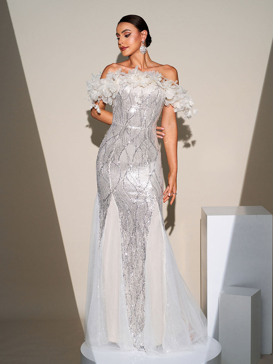 Omuzları açık, işlemeli ve payetli denizkızı kesimli elbisemizle zarafeti ve çekiciliği deneyimleyin! Karmaşık işlemeler ve parıldayan payetler, bu klasik silüete göz alıcı bir dokunuş katıyor. Özel günler için mükemmel olan bu elbise, kendinizi özgüvenli ve çekici hissetmenizi sağlayacak.