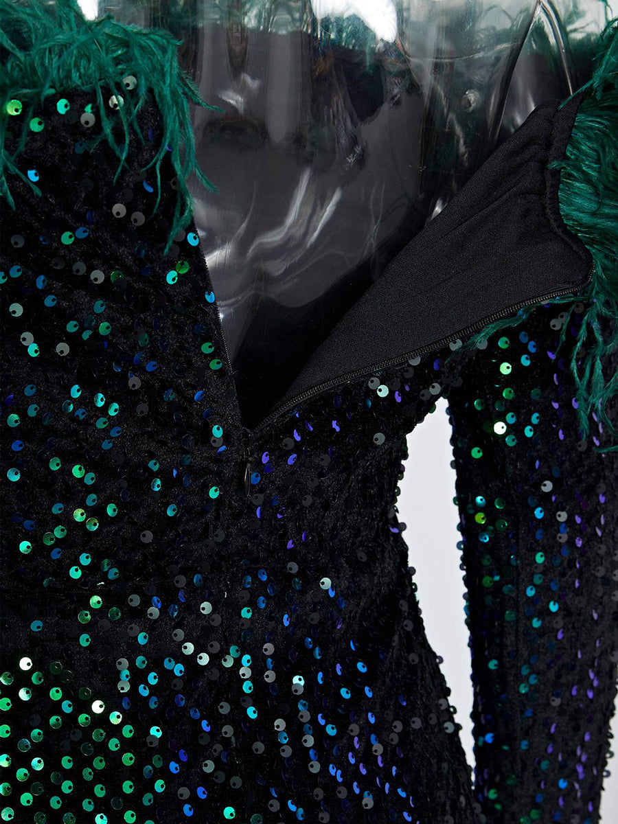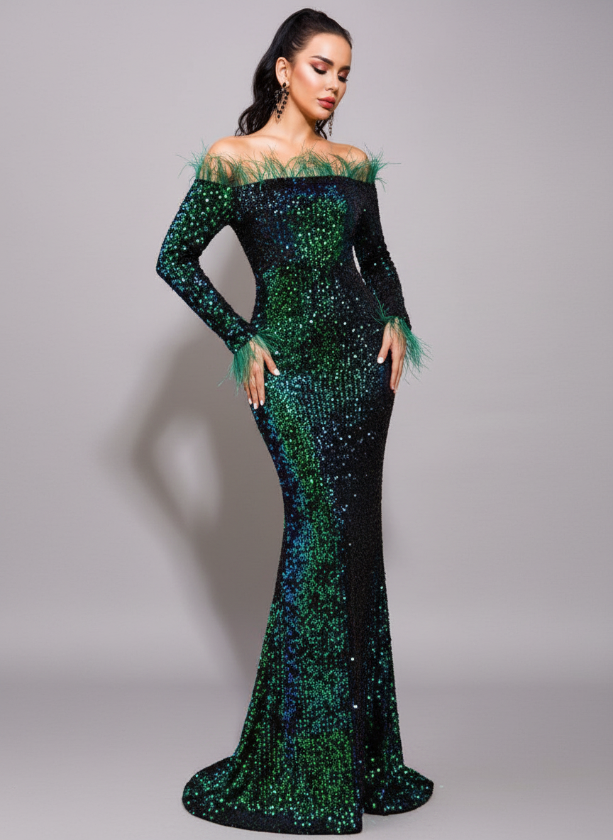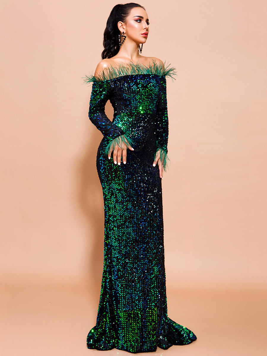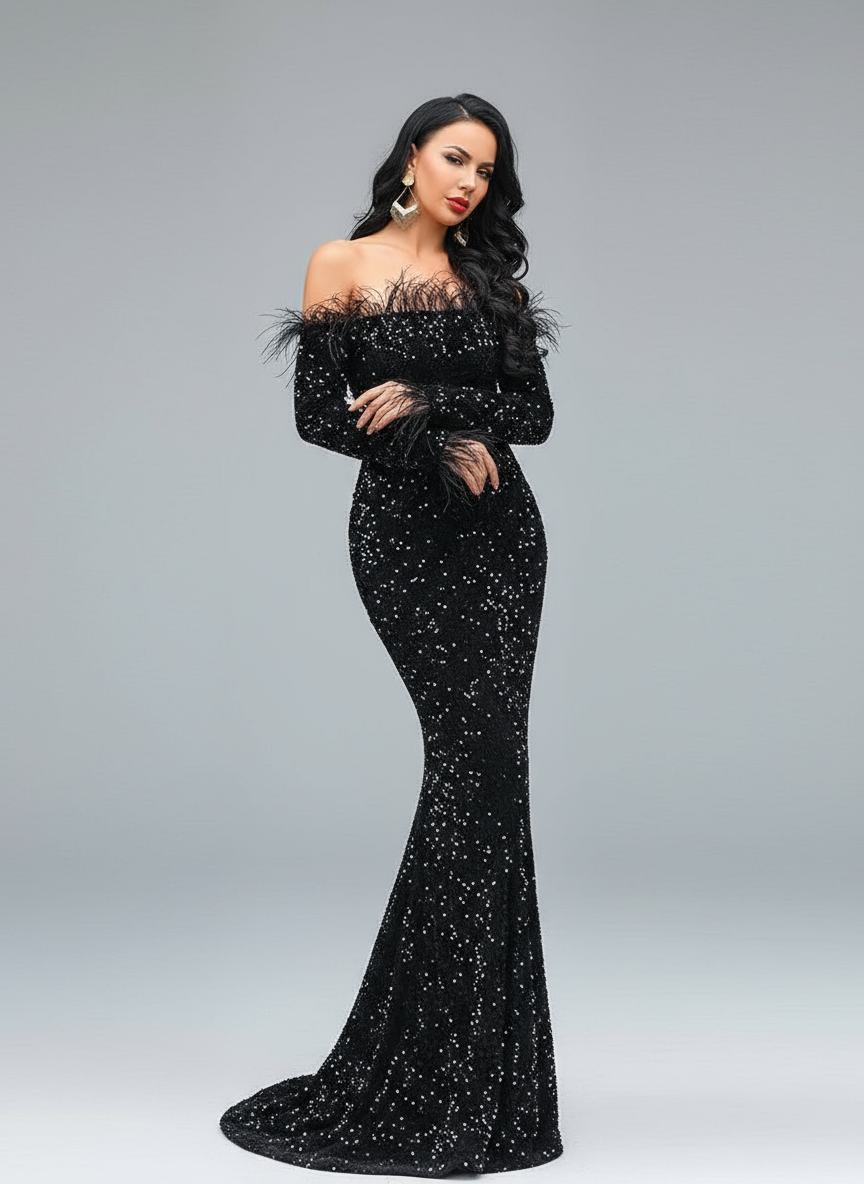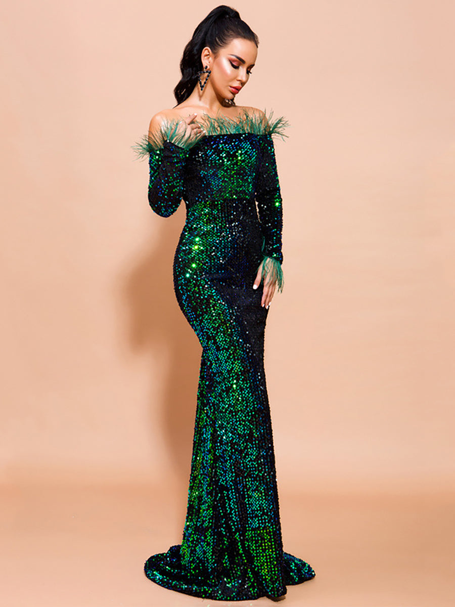 Hesper Omuzsuz Tüy Payetli Abiye Maxi Elbise