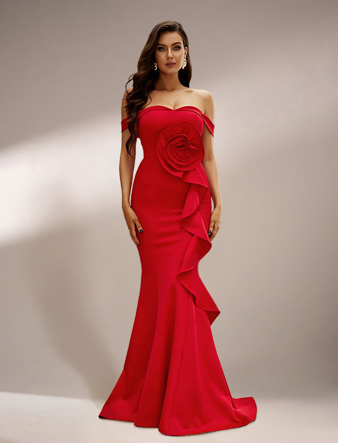 Omuzları açıkta bırakan bu gece elbisesiyle göz kamaştırın. Eşsiz üç boyutlu çiçek detaylarıyla tasarlanan, sırtı ve askısız bu elbise, sofistike bir dokunuş katıyor. Şık bir akşam için mükemmel olan bu elbise, zengin kırmızı veya kahverengi renk seçenekleriyle sunuluyor.