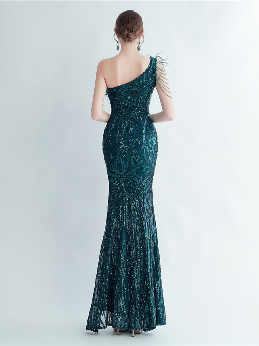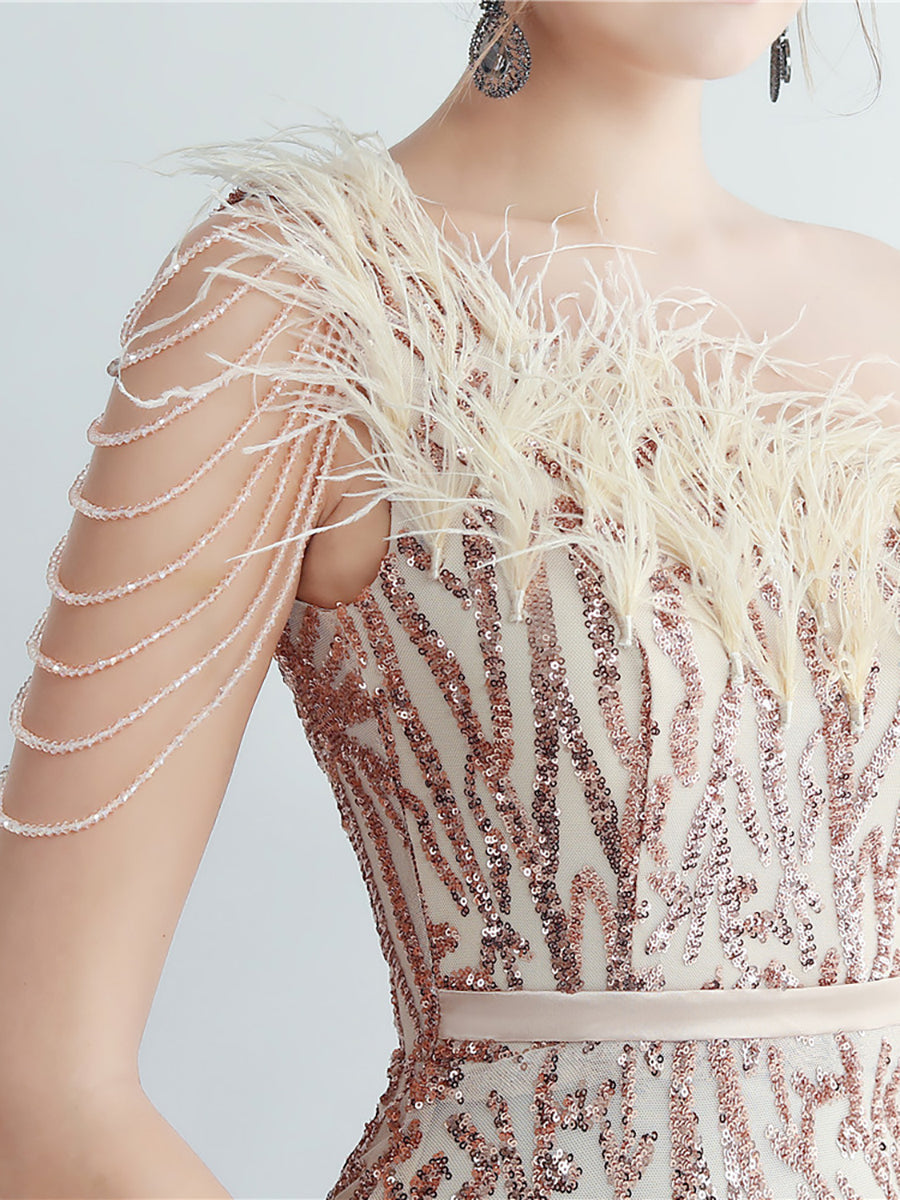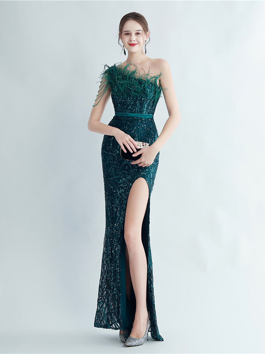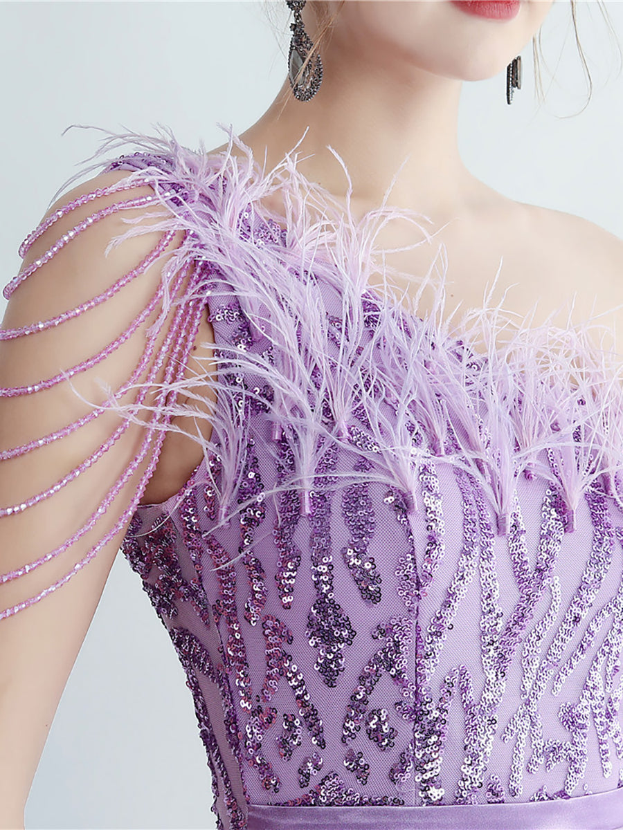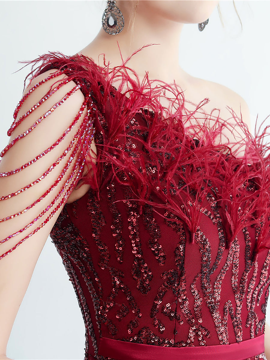 Bu zarif, tek omuzlu, tüy, boncuk ve payet detaylı siyah balo elbisesi, göz alıcı bir görünüm için tüyleri, boncukları ve payetleri bir araya getiriyor. Asimetrik yaka benzersiz bir dokunuş katarken, vücuda oturan tasarımı figürünüzü kusursuzca vurguluyor. Balo veya herhangi bir özel etkinlik için mükemmel olan bu elbise, kesinlikle dikkat çekmenizi sağlayacak.