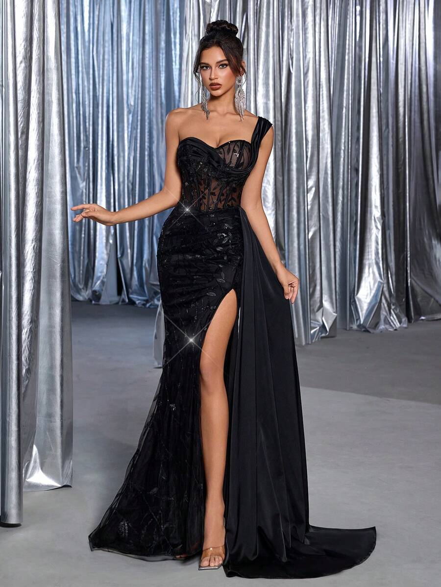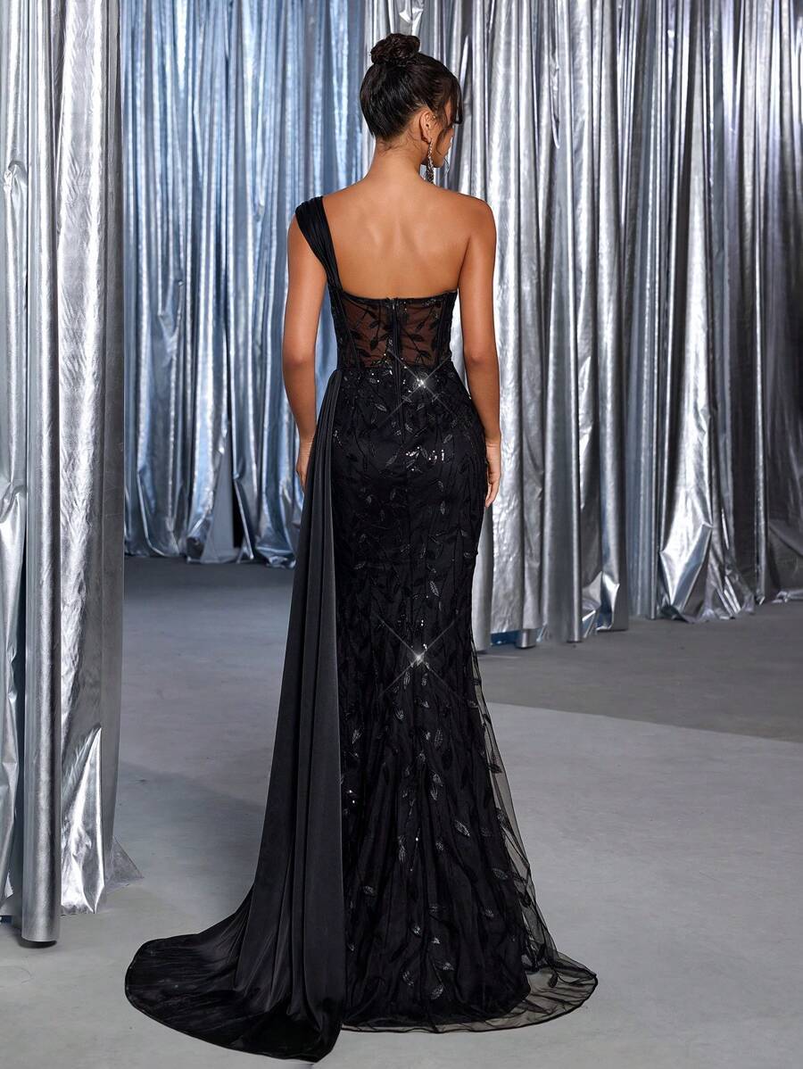 THollis Tek Omuzlu Payetli Korse Maxi Elbise