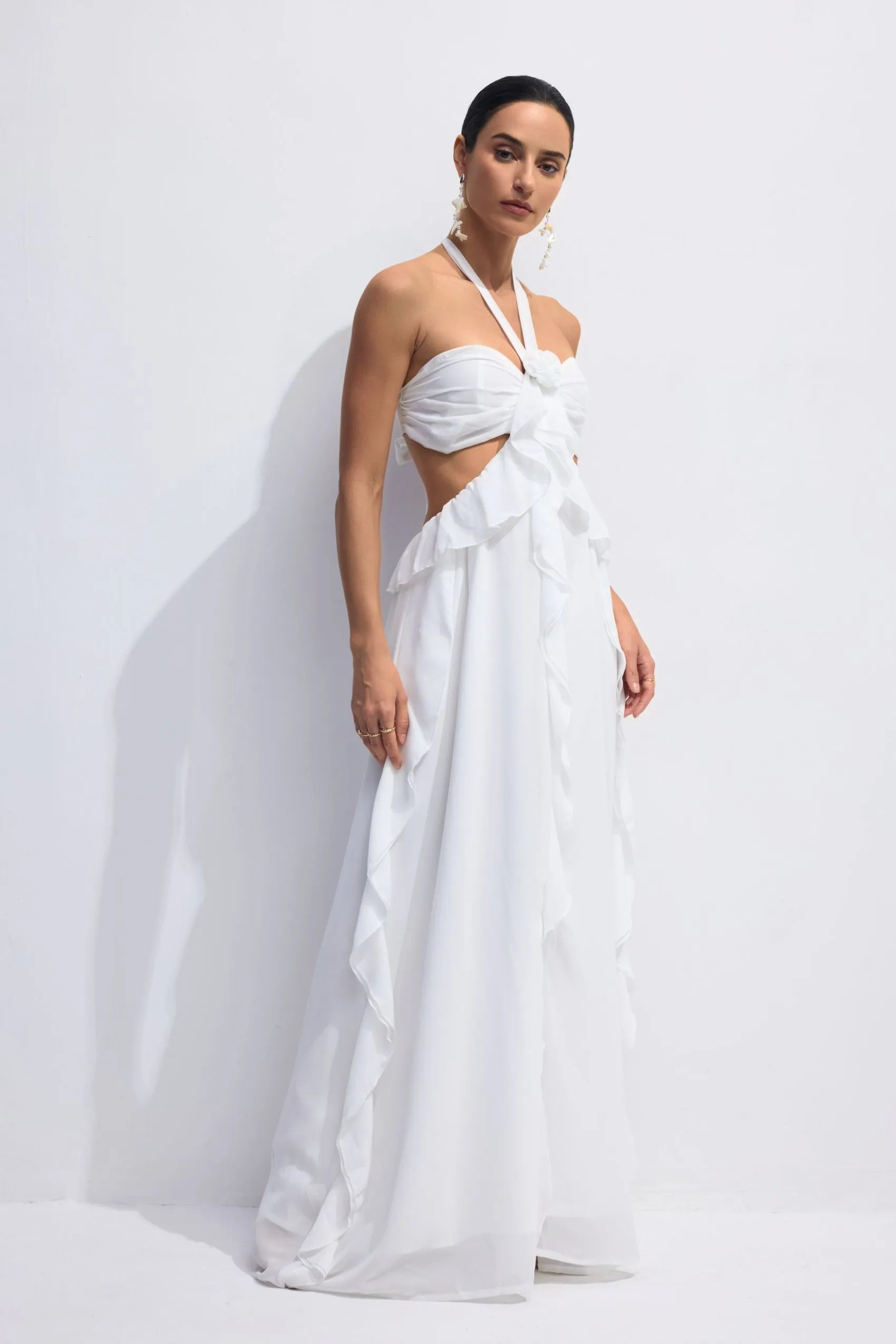 Tasarım Detayları: Bu rüya gibi beyaz askılı elbise, zarif ön düğümlü kalp yaka kesimi, dökümlü fırfırlar ve ön ve arka kısımlarında baştan çıkarıcı dekolteler içeriyor. Tam boy etek her adımda zarifçe dalgalanırken, hafif şifon kumaş romantik ve büyüleyici bir silüet yaratıyor.