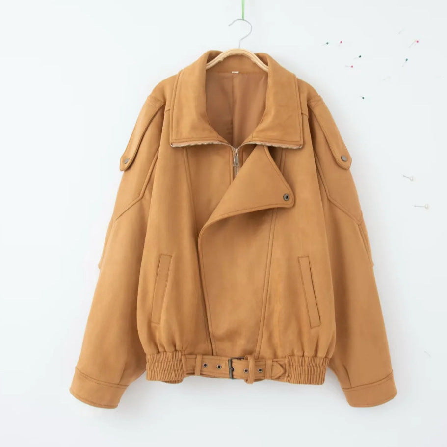 Modern tasarımı ve oversize kesimiyle öne çıkan bu kahverengi ceket, süet görünümlü kumaşıyla hem şık hem de rahat bir kullanım sunar. Geniş yakası ve metal detaylarıyla güçlü bir duruş sergileyen bu parça, sonbahar ve kış kombinlerinin vazgeçilmezi olmaya aday.