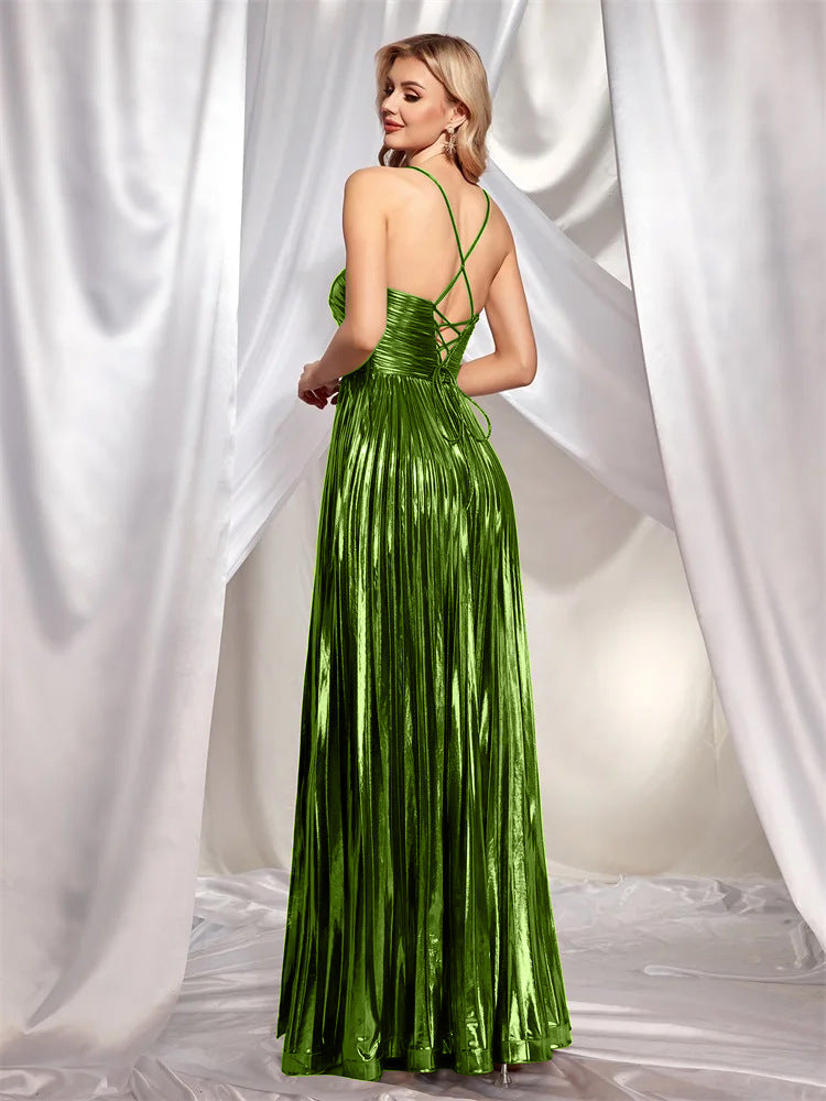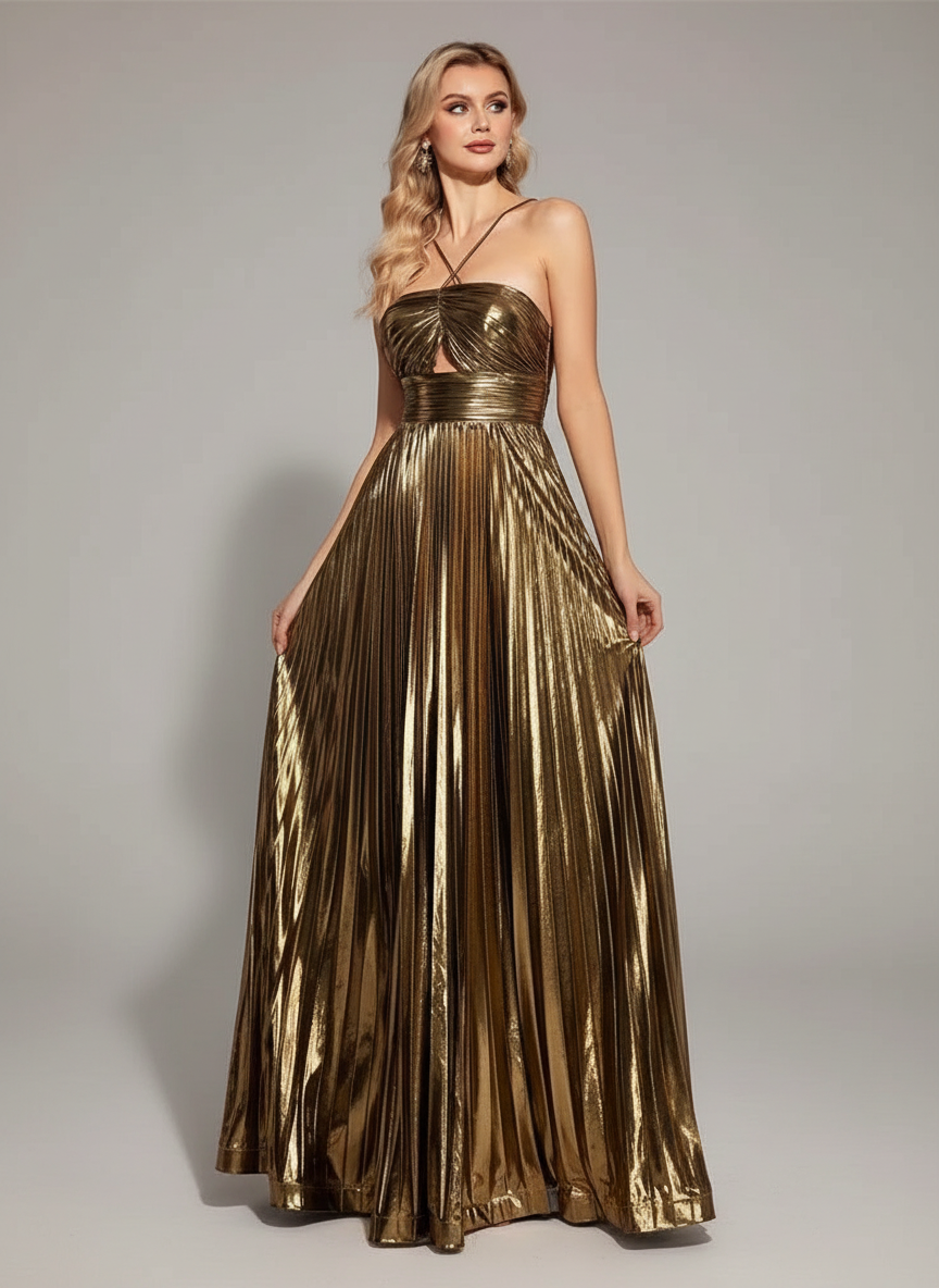 Bu göz alıcı pileli A kesim elbise ile mezuniyet balosunda fark yaratın. Hem dramatik hem de zarif bir görünüm sunan elbise, akıcı eteğiyle zarif bir silüet oluştururken, cesur sırt dekoltesiyle de modern ve şık bir hava katıyor. Dans pistinde dönmek veya unutulmaz fotoğraflar için mükemmel olan bu elbise, herkesin nereden aldığınızı soracağı bir parça olacak!