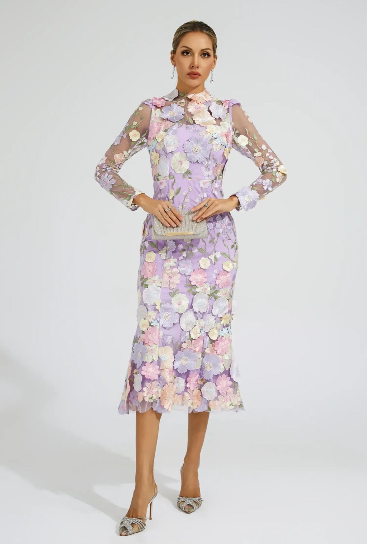 Mor Çiçek İşlemeli Midi Elbise