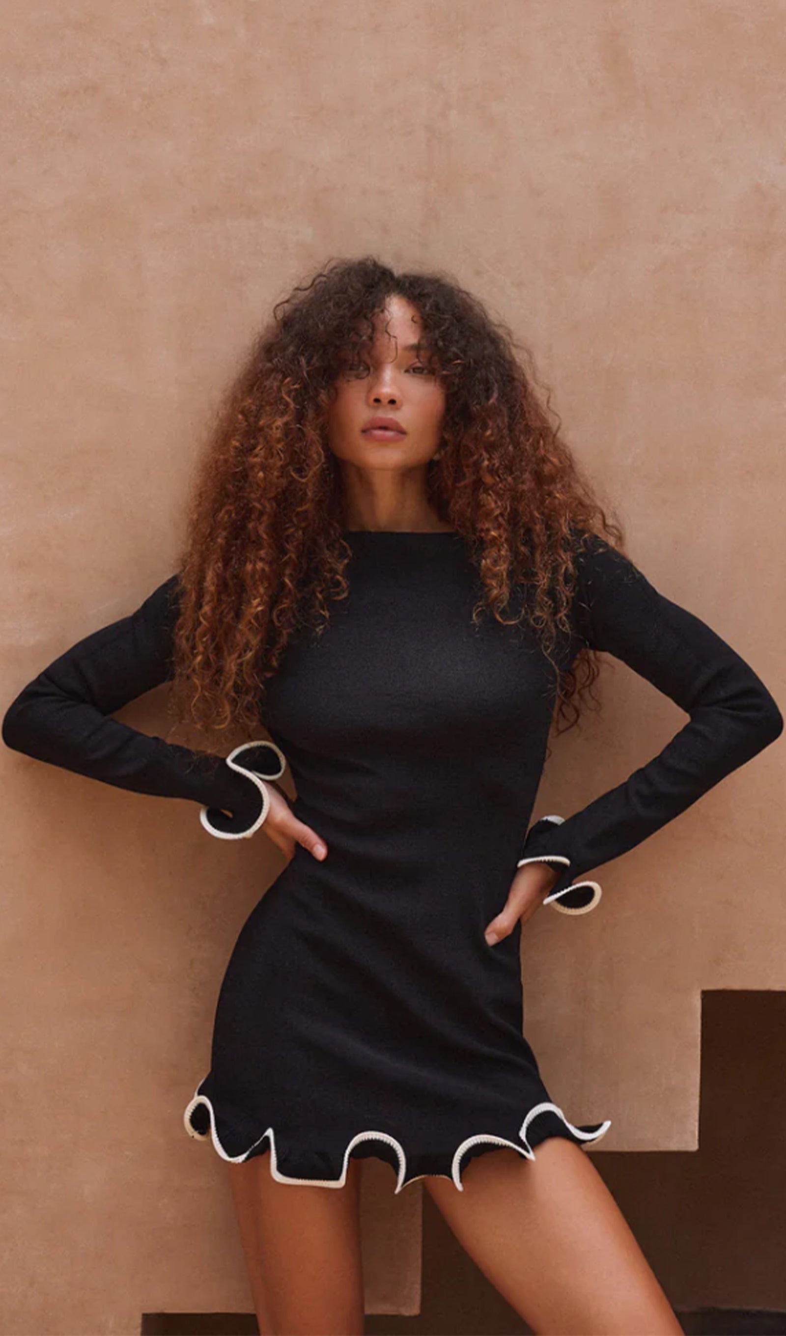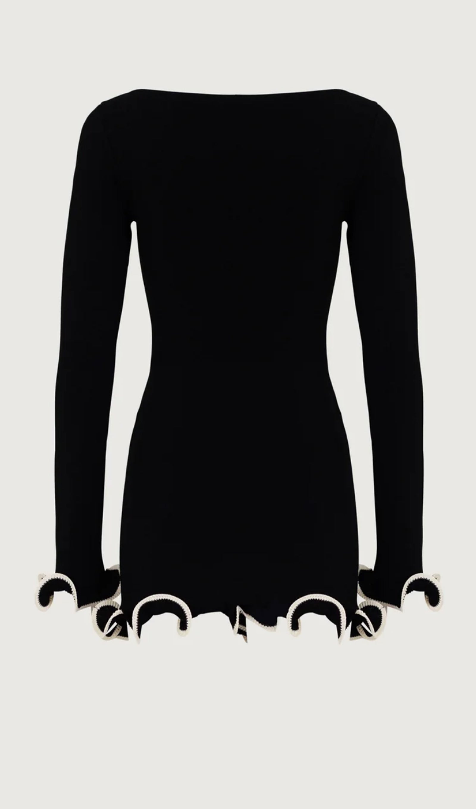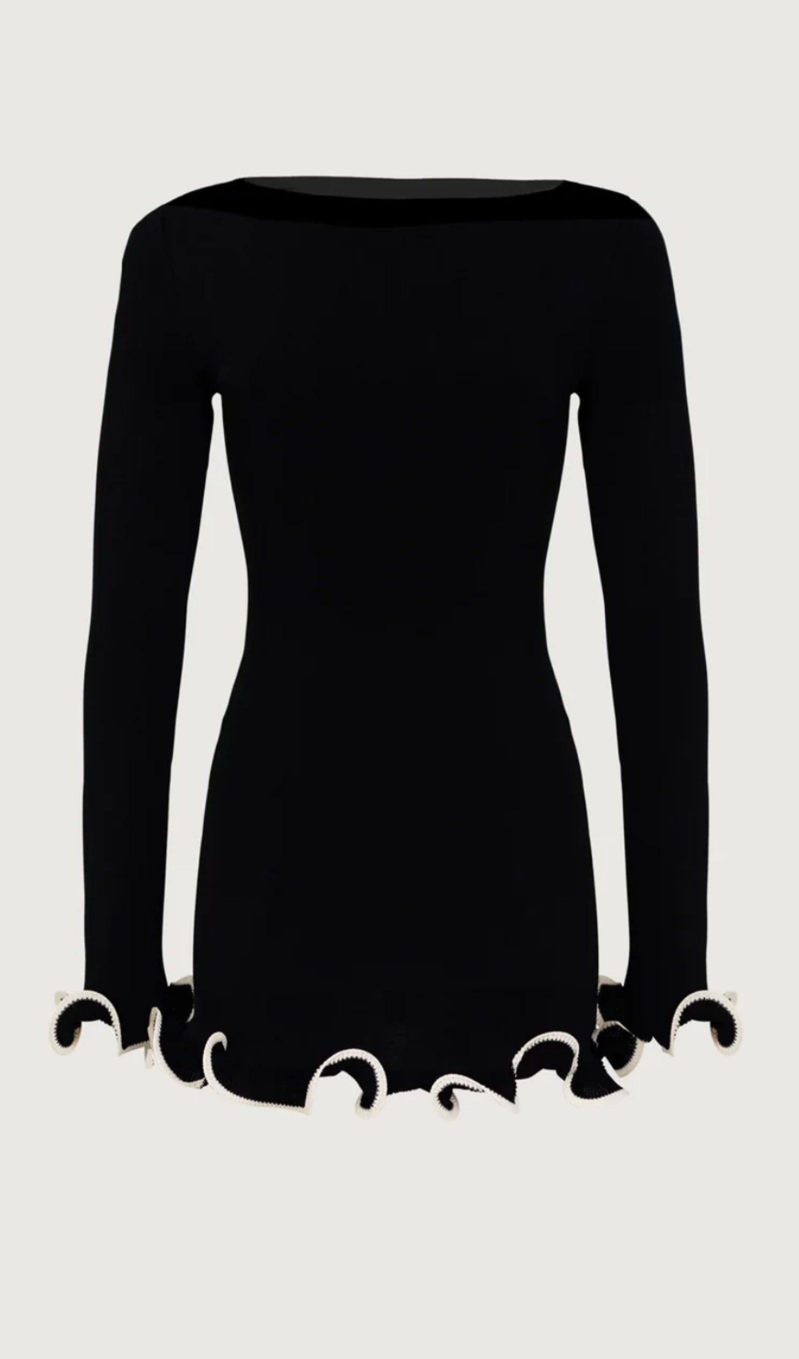 Gündüz veya gece için mükemmel olan zahmetsiz, modaya uygun parçalarla gardırobunuzu yükseltin. Ruffle Hem koleksiyonu, feminen bir dokunuş için yapılandırılmış fırfırlara sahiptir. Bu örgü mini elbise kayık yakalı, yüksek sırtlı ve fırfır etekli uzun kolludur.