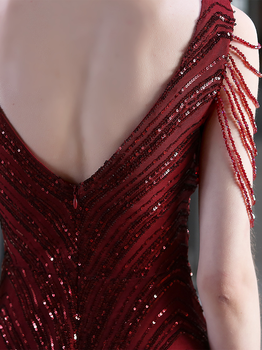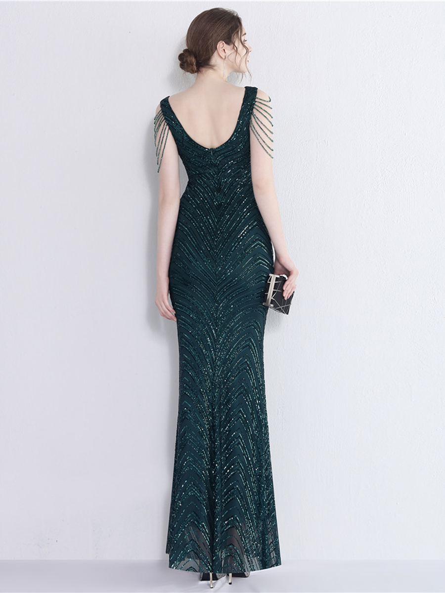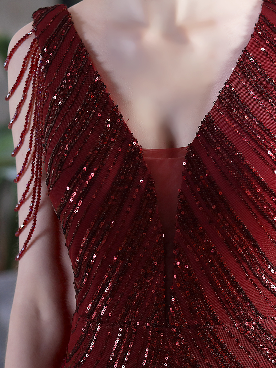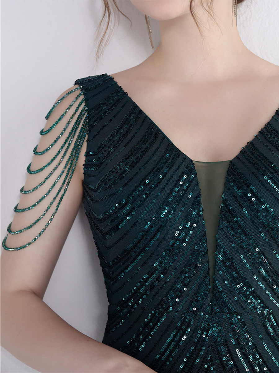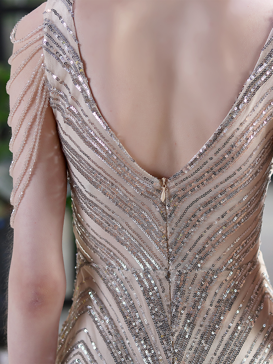 Işıltılı boncuklar ve payetlerle süslenmiş, her hareketinizde ışığı yakalayan, kolsuz, V yakalı bu elbiseyle akşam görünümünüzü bir üst seviyeye taşıyın. Cesur sırt dekoltesi, özel günler için mükemmel kılan bir çekicilik katıyor. Silüetinizi vurgulamak için tasarlanan bu elbise, unutulmaz geceler için zarafeti cesur bir ifadeyle zahmetsizce birleştiriyor.