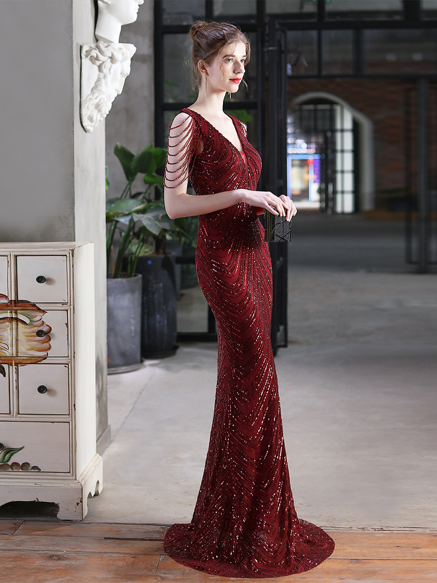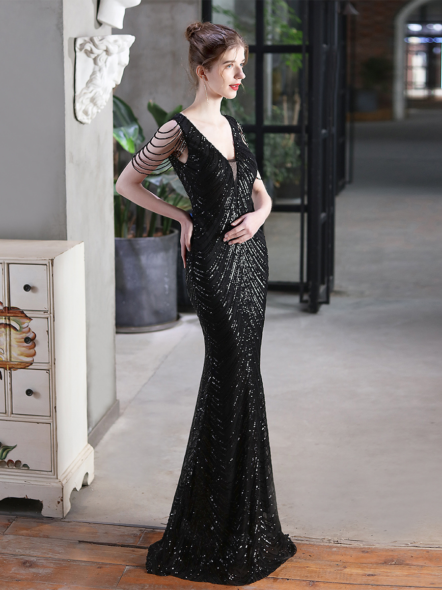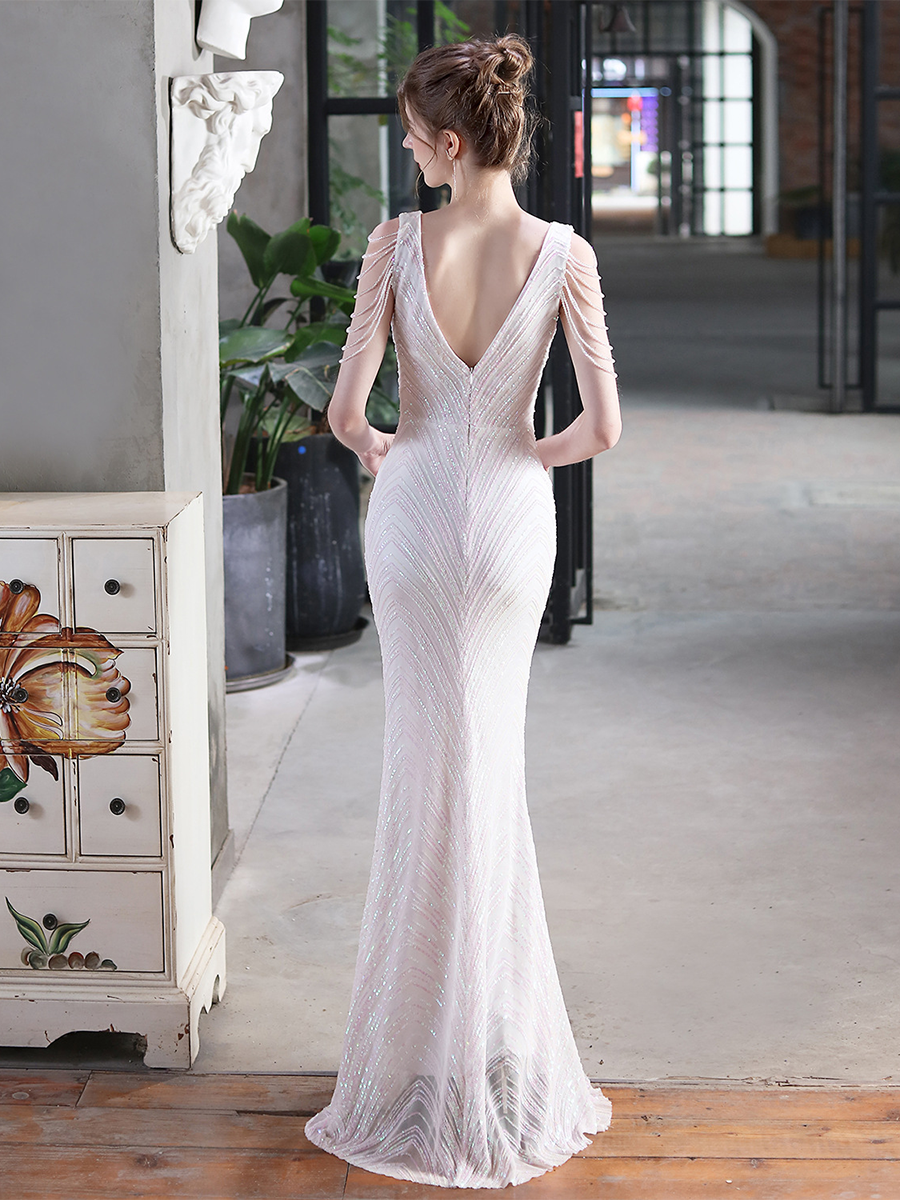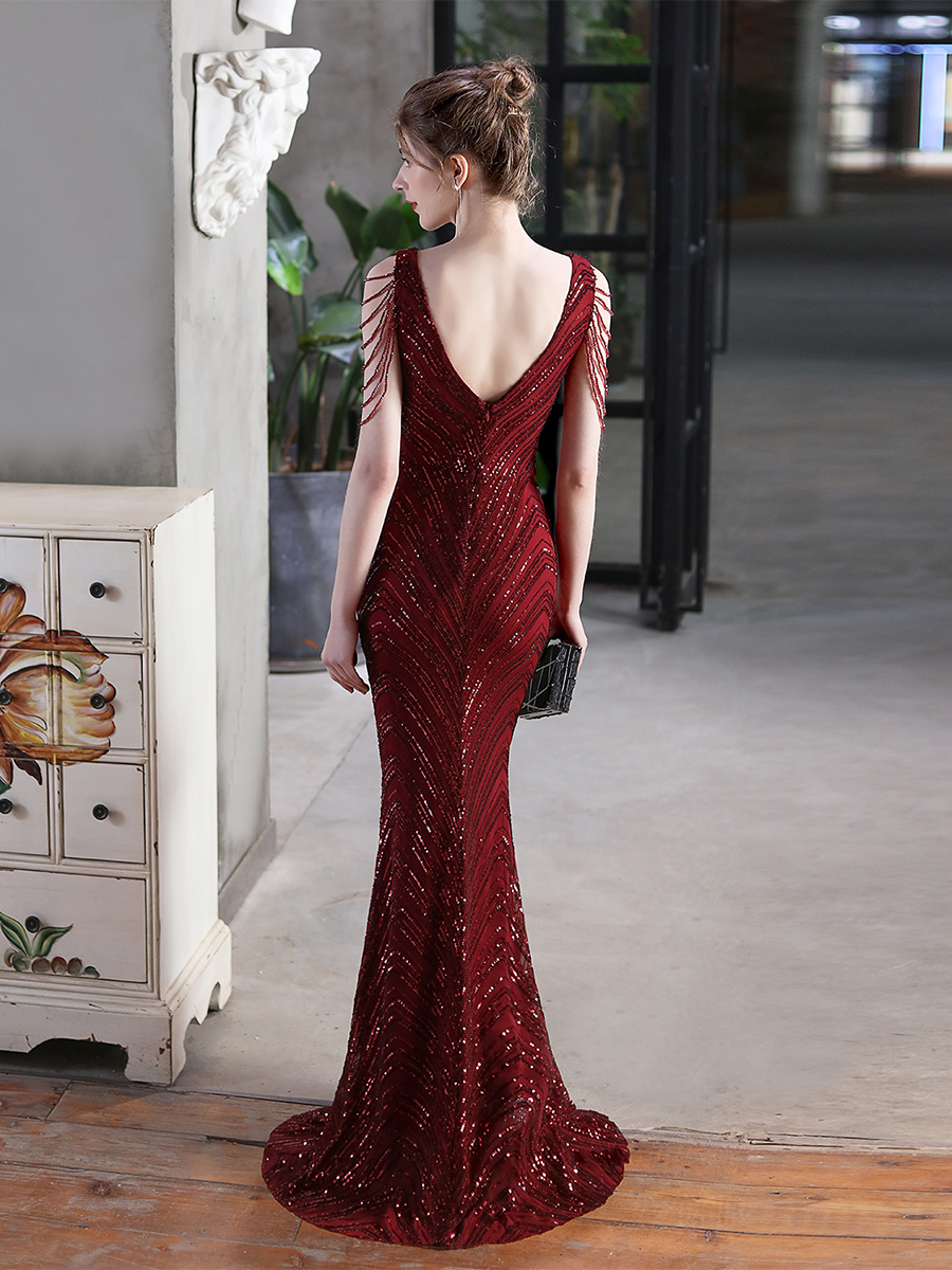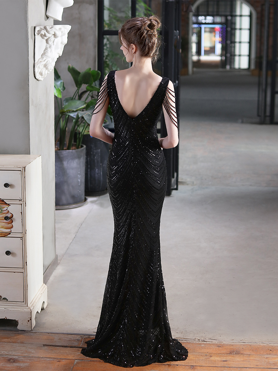 Işıltılı boncuklar ve payetlerle süslenmiş, her hareketinizde ışığı yakalayan, kolsuz, V yakalı bu elbiseyle akşam görünümünüzü bir üst seviyeye taşıyın. Cesur sırt dekoltesi, özel günler için mükemmel kılan bir çekicilik katıyor. Silüetinizi vurgulamak için tasarlanan bu elbise, unutulmaz geceler için zarafeti cesur bir ifadeyle zahmetsizce birleştiriyor.