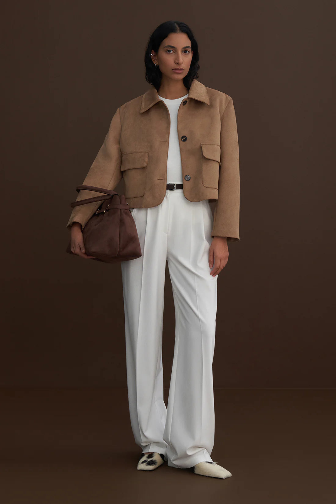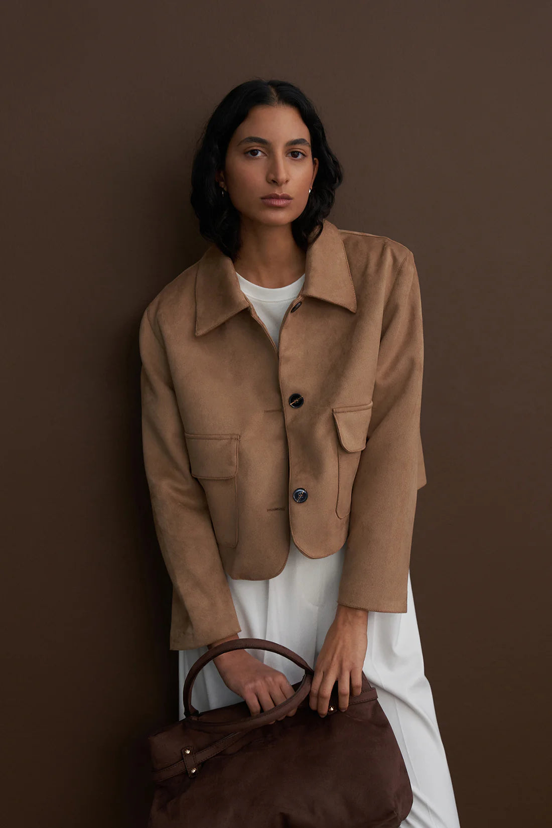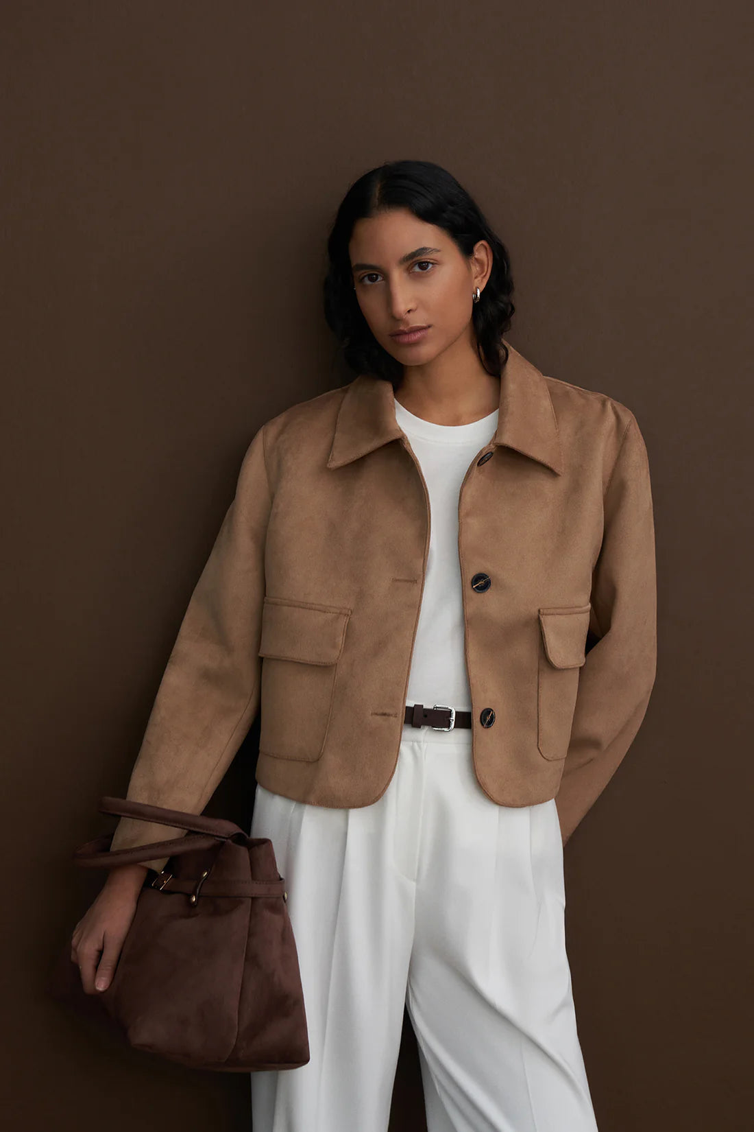 Süet dokusu ve kısa boy tasarımıyla öne çıkan bu ceket, modern ve şık bir görünüm sunar. Rahat kesimi sayesinde hem günlük hem de özel kombinlerde kolayca kullanılabilir.